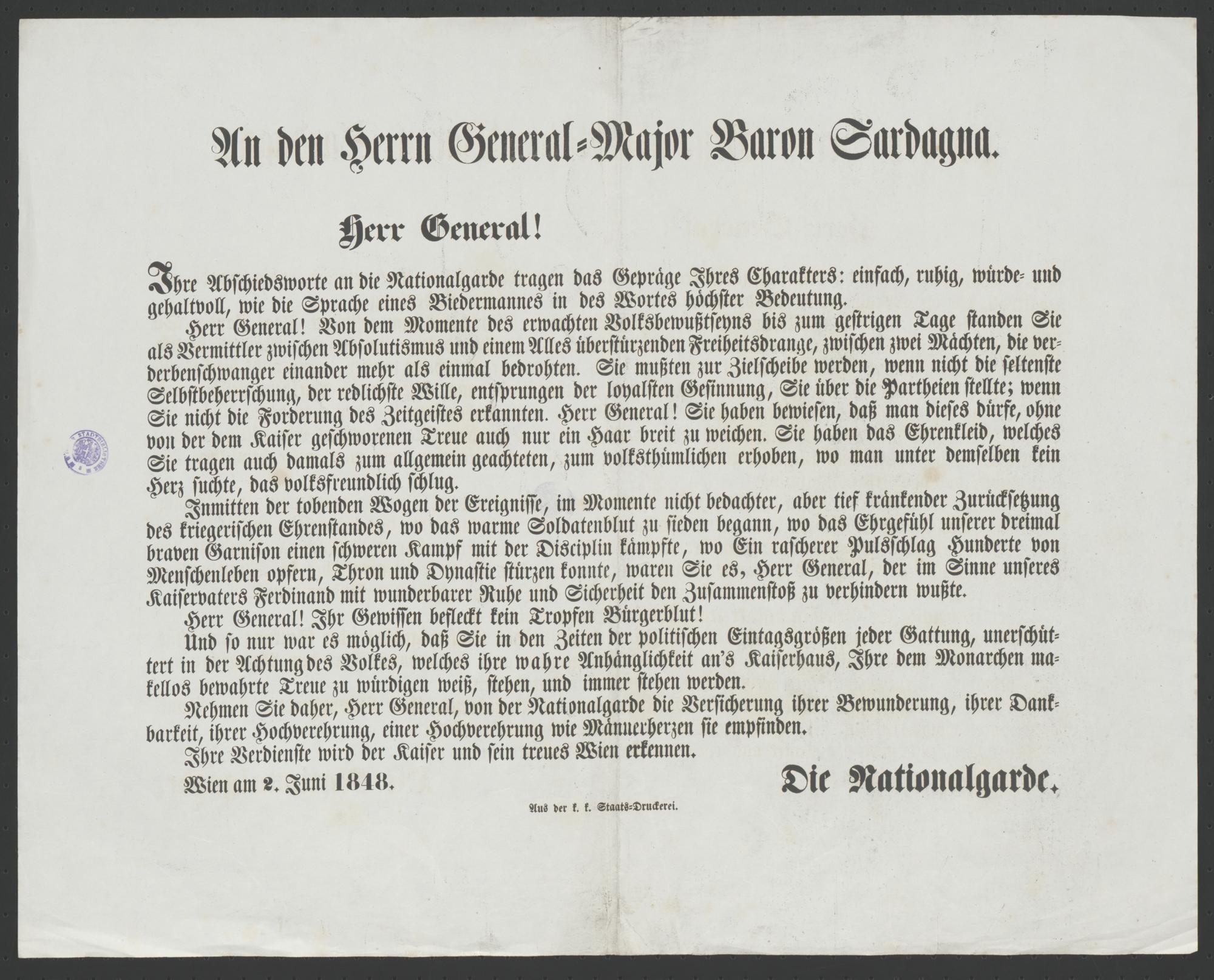 An den Herrn General-Major Baron Sardagna. Herr General! : Ihre Abschiedsworte an die Nationalgarde tragen das Gepräge Ihres Charakters: einfach, ruhig, würde- und gehaltvoll, wie die Sprache eines Biedermannes in des Wortes höchster Bedeutung ... ; Wien am 2. Juni 1848 / Die Nationalgarde