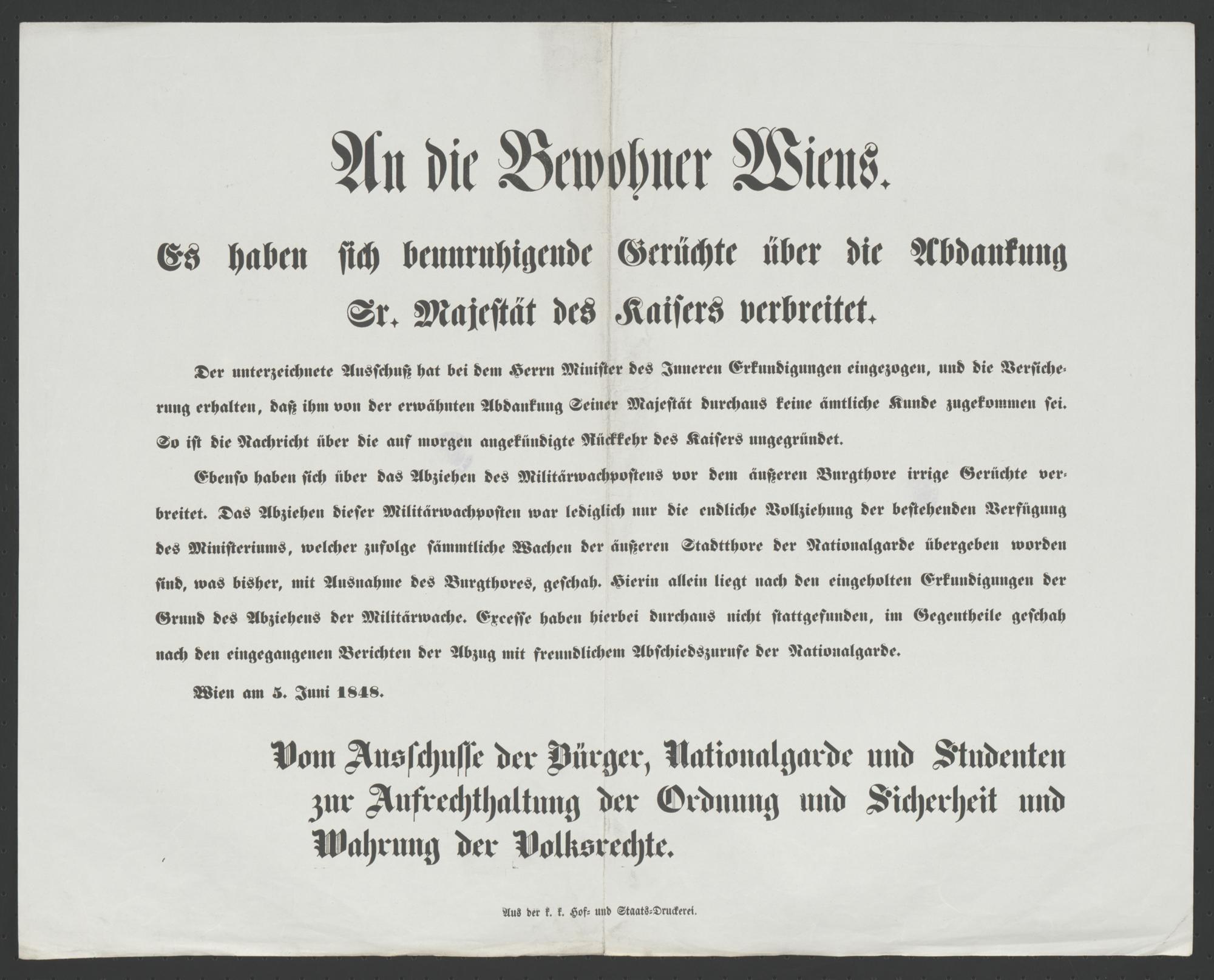 An die Bewohner Wiens [Wien, 5. Juni 1848] : Es haben sich beunruhigende Gerüchte über die Abdankung Sr. Majestät des Kaisers verbreitet... ; Wien am 5. Juni 1848 / Vom Ausschusse der Bürger, Nationalgarde und Studenten zur Aufrechthaltung der Ordnung und Sicherheit und Wahrung der Volksrechte