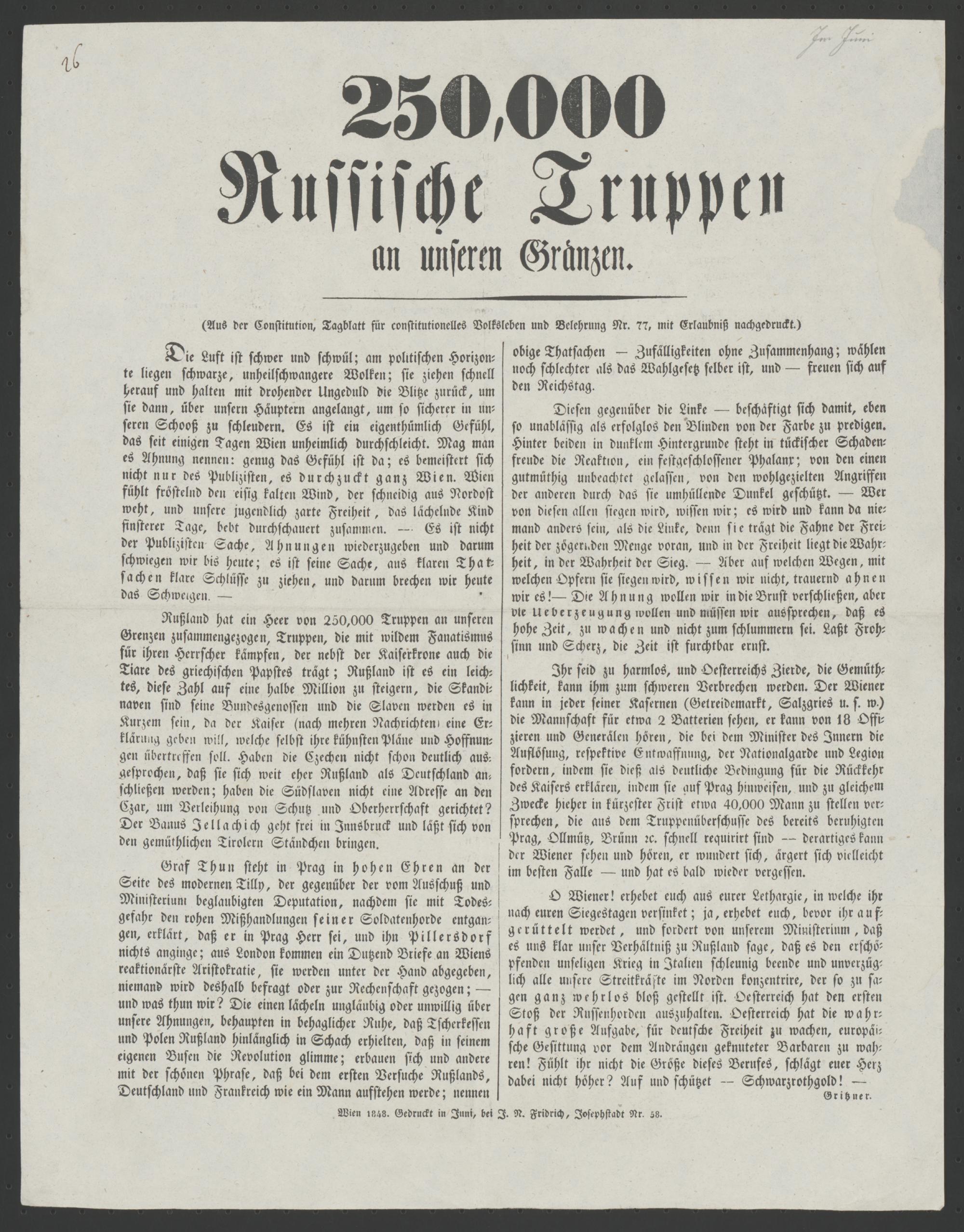 250,000 Russische Truppen an unseren Gränzen : (Aus der Constitution, Tagblatt für constitutionelles Volksleben und Belehrung Nr. 77, mit Erlaubniß nachgedruckt) / Gritzner