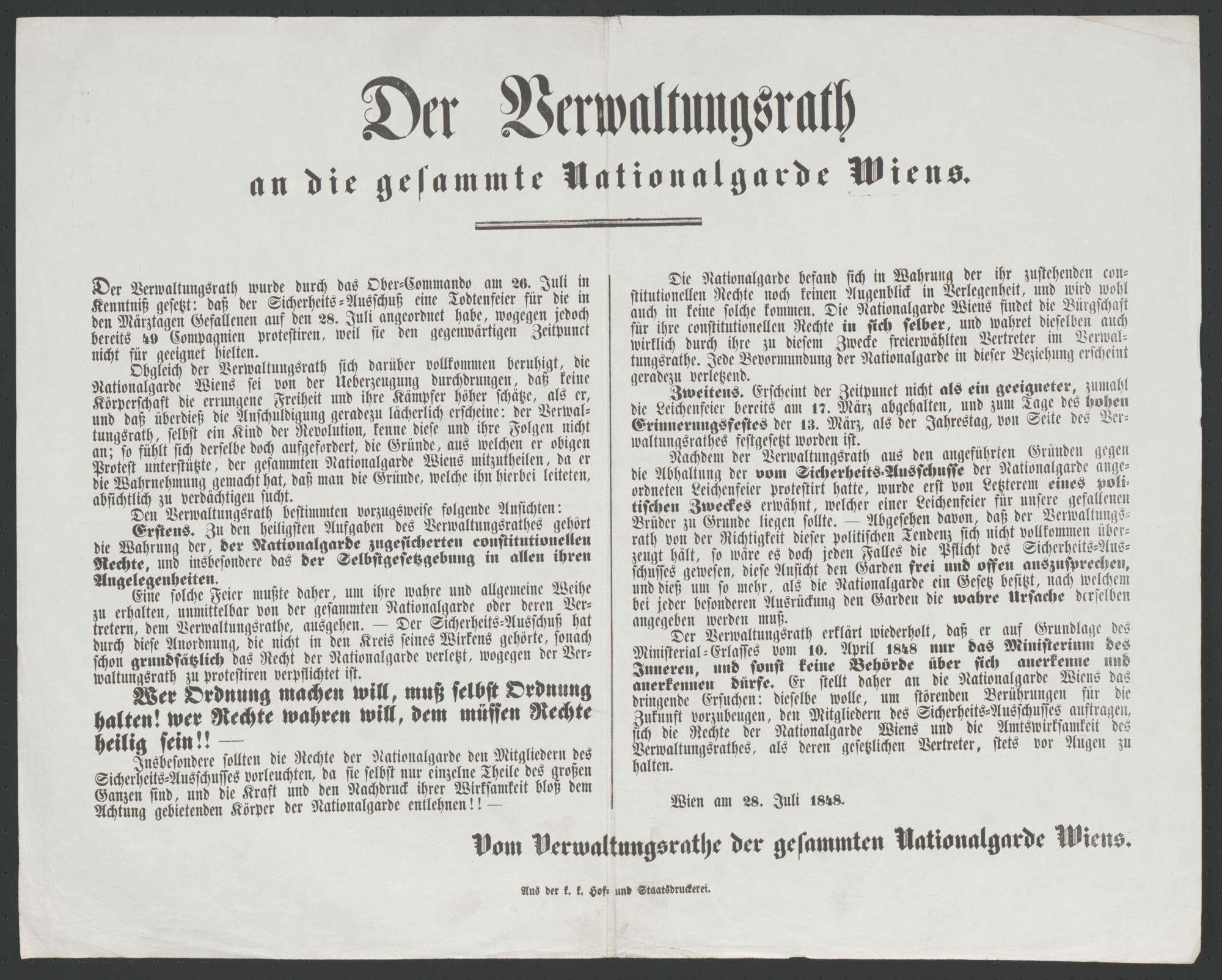 Der Verwaltungsrath an die gesammte Nationalgarde Wiens : Der Verwaltungsrath wurde durch das Ober-Commando am 26. Juli in Kenntniß gesetzt: daß der Sicherheits-Ausschuß eine Todtenfeier für die in den Märztagen Gefallenen auf den 28. Juli angeordnet habe, wogegen jedoch bereits 49 Compagnien protestiren, weil sie den gegenwärtigen Zeitpunct nicht für geeignet hielten ... ; Wien am 28. Juli 1848 / Vom Verwaltungsrathe der gesammten Nationalgarde Wiens