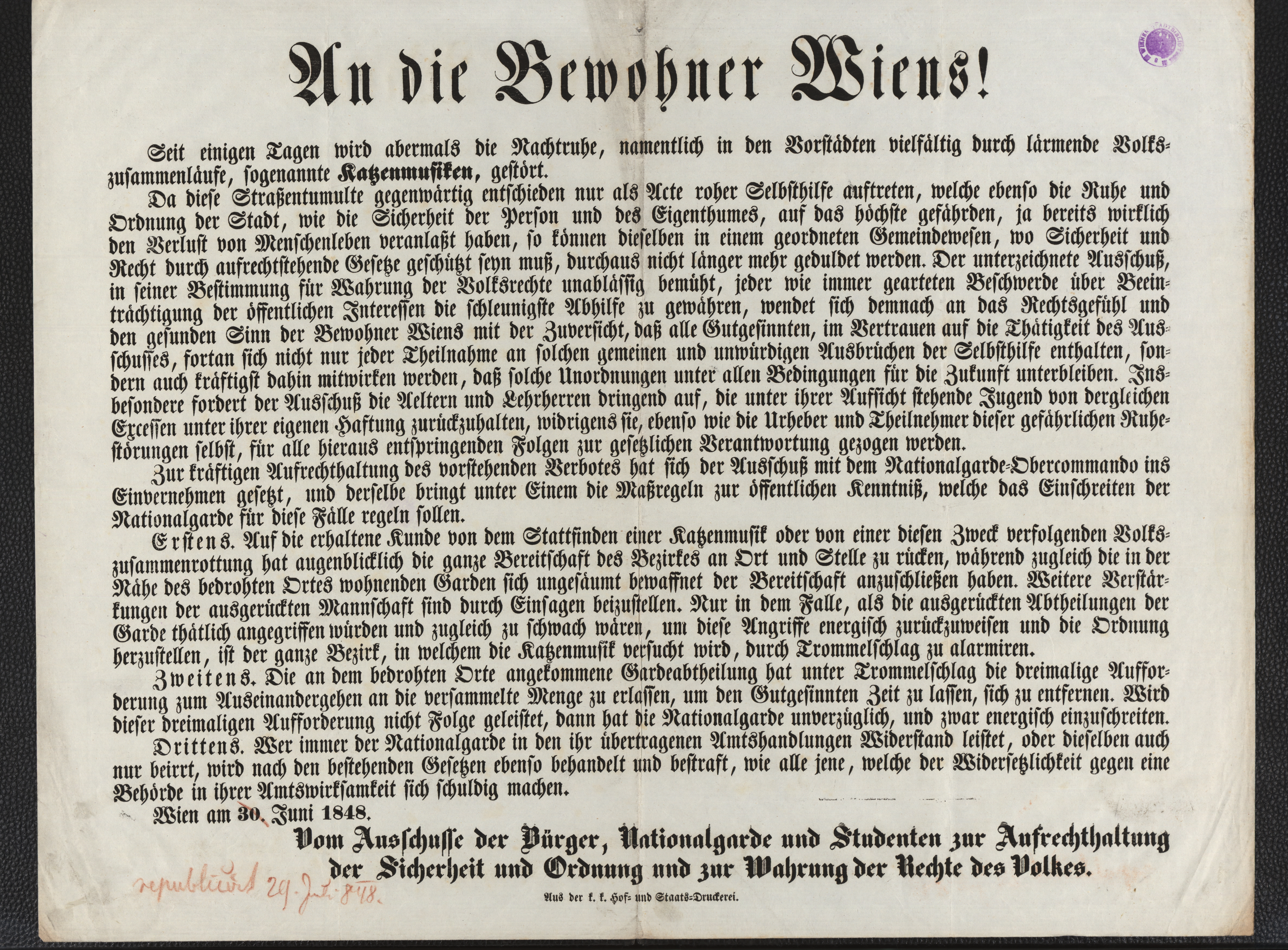 An die Bewohner Wiens! [Wien, 30. Juni 1848] : Seit einigen Tagen wird abermals die Nachtruhe, namentlich in den Vorstädten vielfältig durch lärmende Volks-Zusammenläufe, sogenannte Katzenmusiken gestört. Da diese Straßentumulte gegenwärtig entschieden nur als Acte roher Selbsthilfe auftreten ... können dieselben in einem geordneten Gemeindewesen ... durchaus nicht länger mehr geduldet werden ... ; Wien am 30. Juni 1848 / Vom Ausschusse der Bürger, Nationalgarde und Studenten zur Aufrechthaltung der Sicherheit und Ordnung und zur Wahrung der Rechte des Volkes