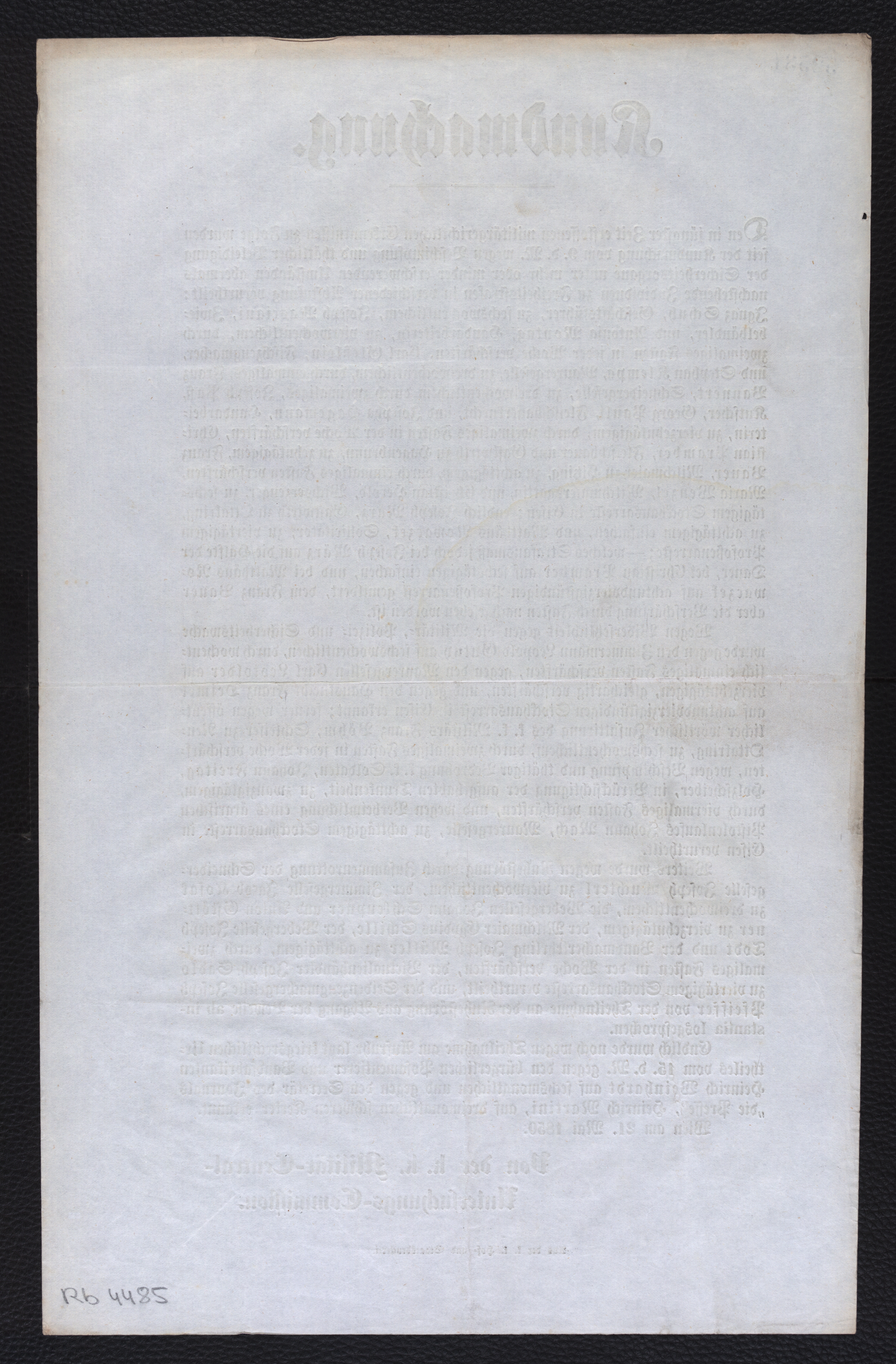 Kundmachung [Wien, 21. Mai 1850] : Den in jüngster Zeit erflossenen militärgeschichtlichen Erkenntnissen zu Folge wurden seit der Kundmachung vom 9. d. M. wegen Beschimpfung und thätlicher Beleidigung der Sicherheitsorgane unter mehr oder minder erschwerenden Umständen abermals nachstehende Individuen zu Freiheitsstrafen in verschiedener Abstufung verurtheilt: Ignaz Schuh ... ; Wien am 21. Mai 1850 / Von der k. k. Militär-Central-Untersuchungs-Commission