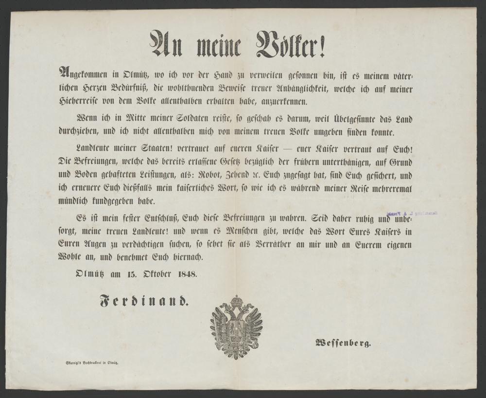 An meine Völker! : Angekommen in Olmütz, wo ich vor der Hand zu verweilen gesonnen bin, ist es meinem väterlichen Herzen Bedürfniß, die wohlthuenden Beweise treuer Anhänglichkeit, welche ich auf meiner Hieherreise von dem Volke allenthalben erhalten habe, anzuerkennen ... ; Olmütz am 15. Oktober 1848 / Ferdinand. Wessenberg