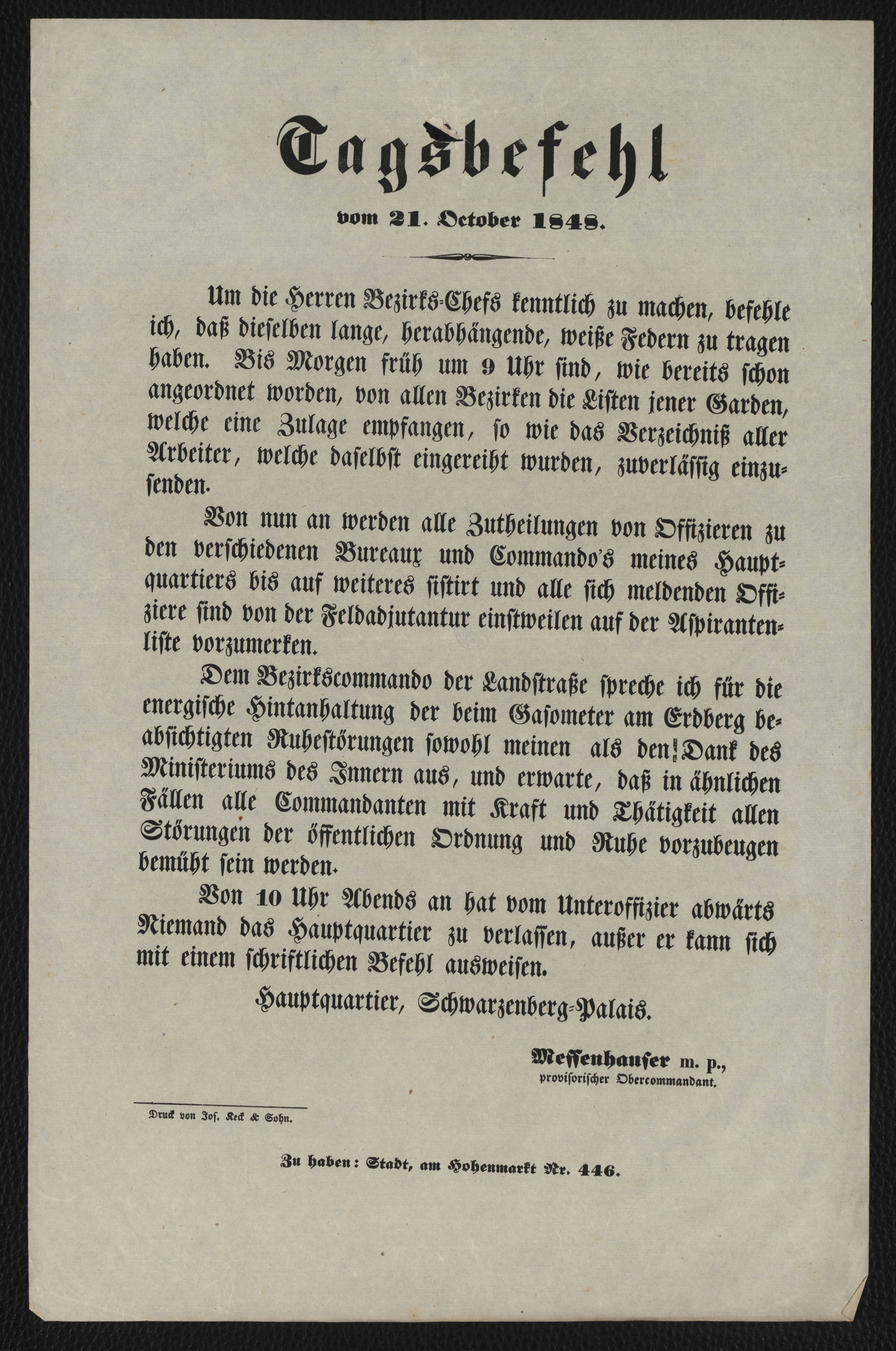 Tagsbefehl vom 21. October 1848 : Um die Herren Bezirks-Chefs kenntlich zu machen, befehle ich, daß dieselben lange, herabhängende, weiße Federn zu tragen haben ... ; Hauptquartier, Schwarzenberg-Palais / Messenhauser m. p., provisorischer Obercommandant