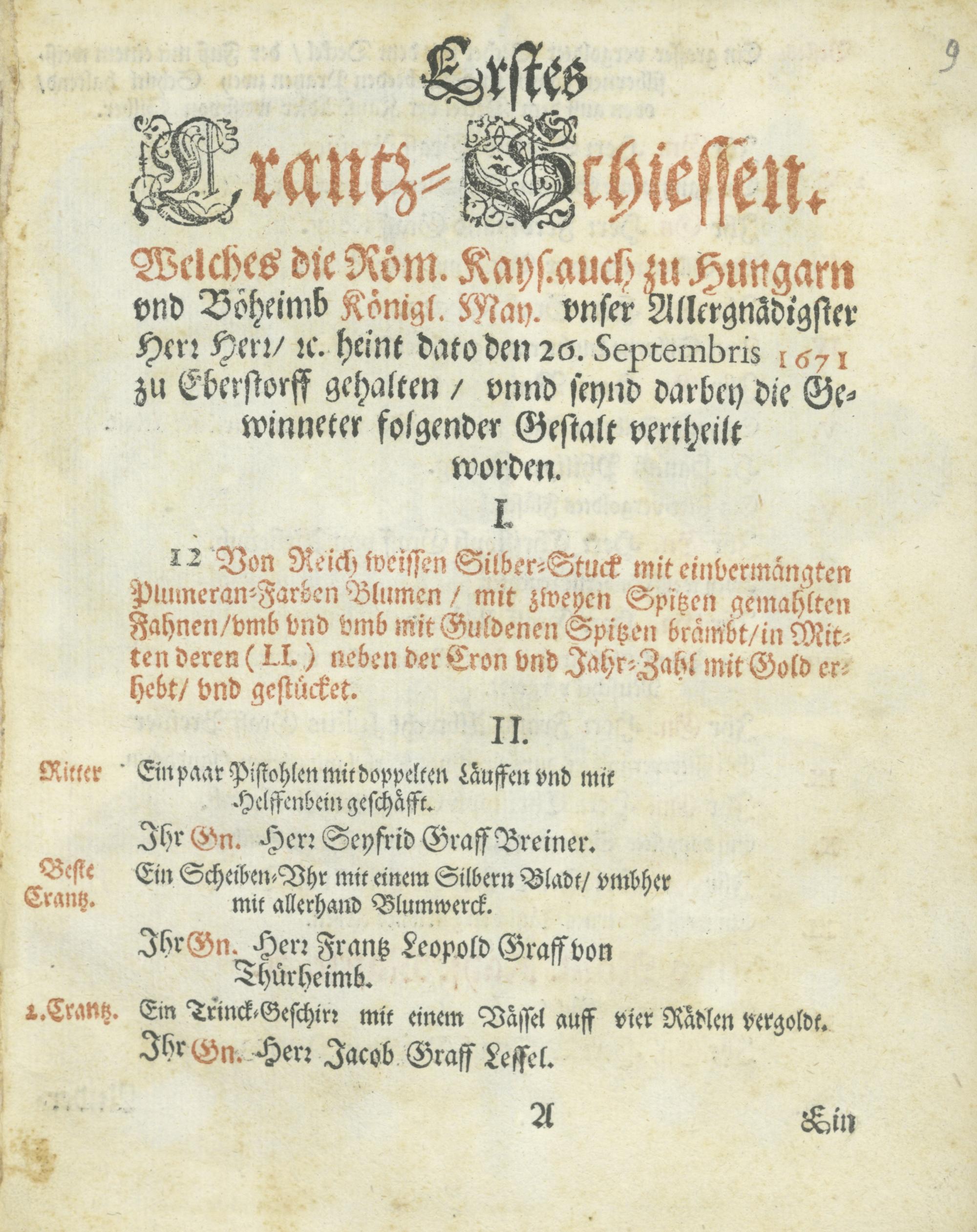 Abriß und Beschreibung Anno M.DC.LXXI. Deß von dem Allerdurchleuchtigst. Großmächtigst. vnd Vnüberwündlichsten Römischen Kaysers, auch zu Hungarn vnd Böheimb Königs, [et]c. Ertz-Hertzogen zu Oesterreich Leopoldi Deß Ersten, [et]c. Allergnädigist gehaltenen Ritterlichen Crantz-Schiessen : Wie selbiges von denen Mit-Anwesenden Fürsten, Graffen vnd Herren, in Ordnung nacheinander gehalten, auch was von denselben vor inventir- vnd gemahlte Scheyben vnd Fahnen, nebenst den Gewinnetern gegeben, vnd nach invermeldter Specification außgetheilt worden. Zu einem Glückseligen, Freudenreichen Neuen-Jahr Allervnterthänigst gehörsambst dedicirt. Anno M.DC.LXXII. / Wolffgang von Hanfeld, Röm. Kays. Mayest. Leib-Quardi Hartschier