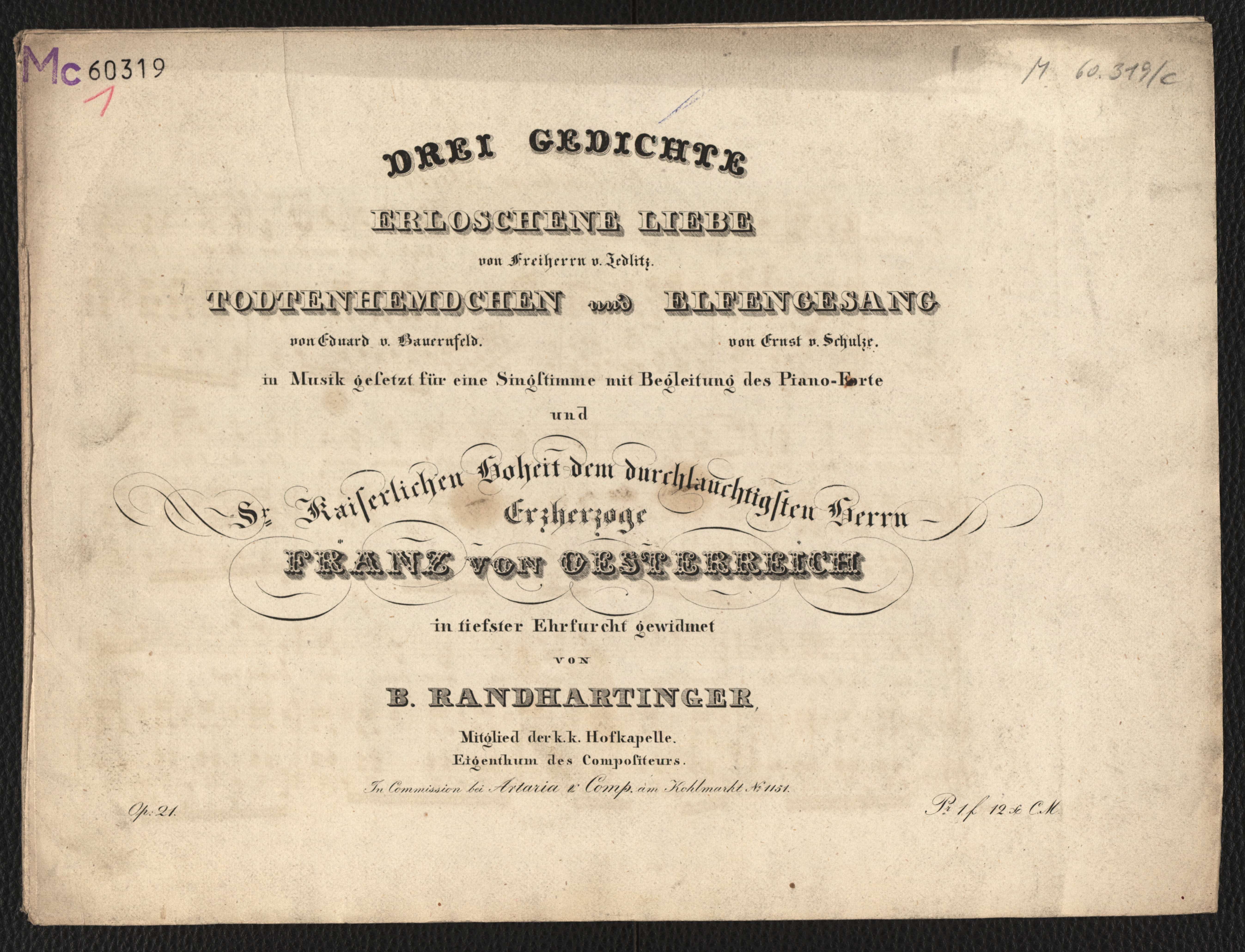 Drei Gedichte: "Erloschene Liebe", "Todtenhemdchen" und "Elfengesang" : für eine Singstimme und Klavier ; op. 21 / In Musik gesetzt von Benedikt Randhartinger. (Zedlitz, Bauernfeld und Schulze). E.H. Franz von Österreich gewidmet