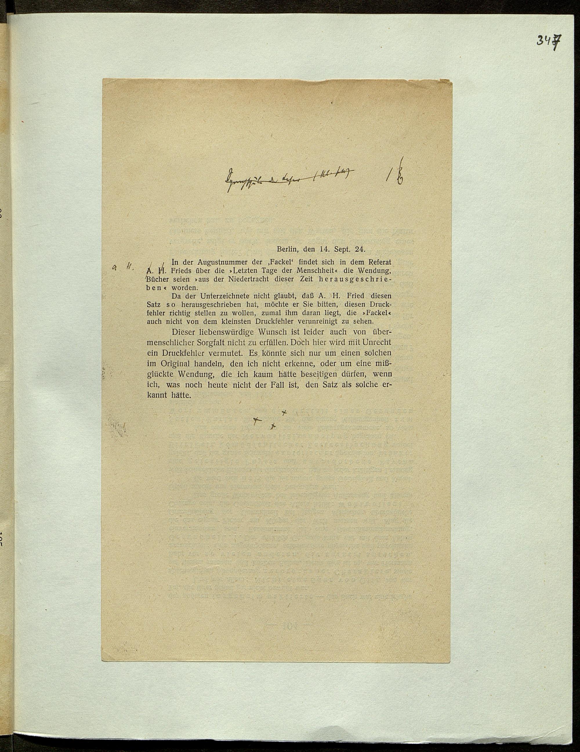 Druckfahnen von Karl Kraus zur Fackel Nr. 668/675