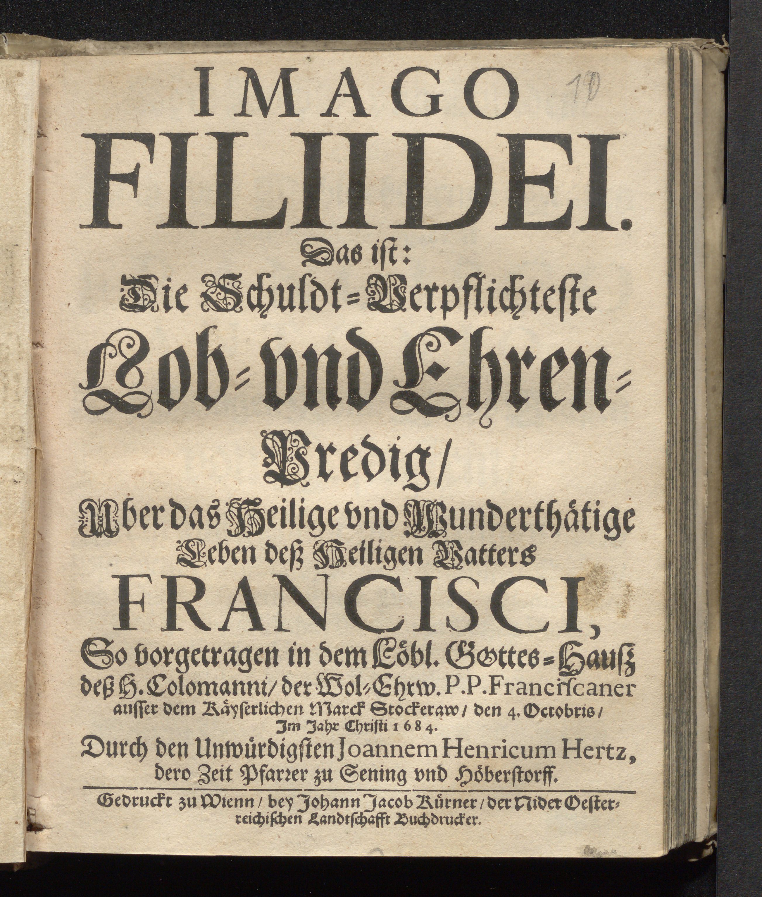 Imago Filii Dei. Das ist: Die Schuldt-Verpflichteste Lob- und Ehren-Predig, Uber das Heilige vnd Wunderthätige Leben deß Heiligen Vatters Francisci : So vorgetragen in dem Löbl. Gottes-Hauß deß H. Colomanni, der Wol-Ehrw. P.P. Franciscaner ausser dem Käyserlichen Marck Stockeraw, den 4. Octobris, Im Jahr Christi 1684 / Durch den Unwürdigsten Joannem Henricum Hertz, dero Zeit Pfarrer zu Sening vnd Höberstorff