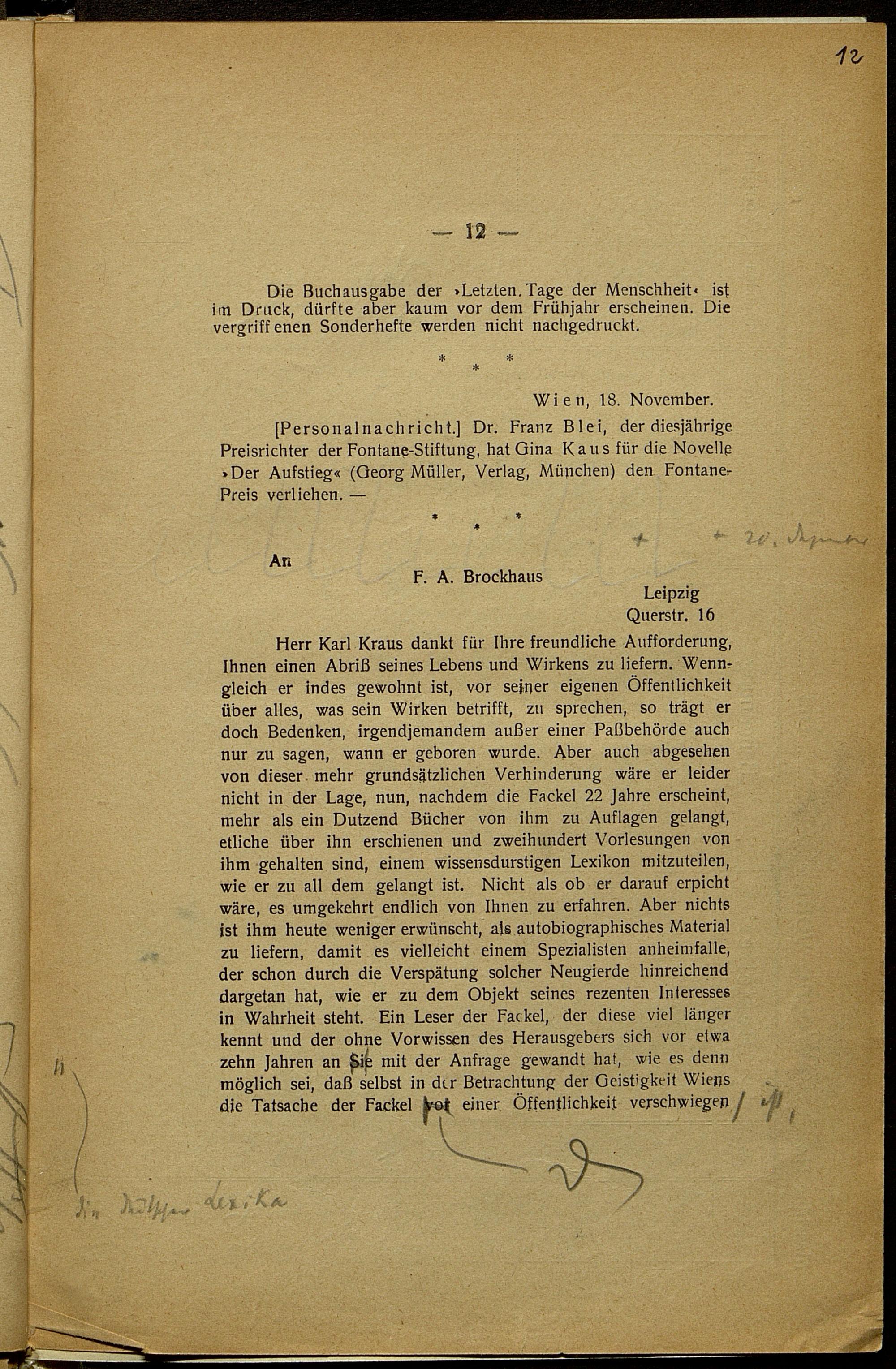 Druckfahnen nach dem Umbruch mit 1.-4. Redaktion von Karl Kraus zur Fackel Nr. 557/560