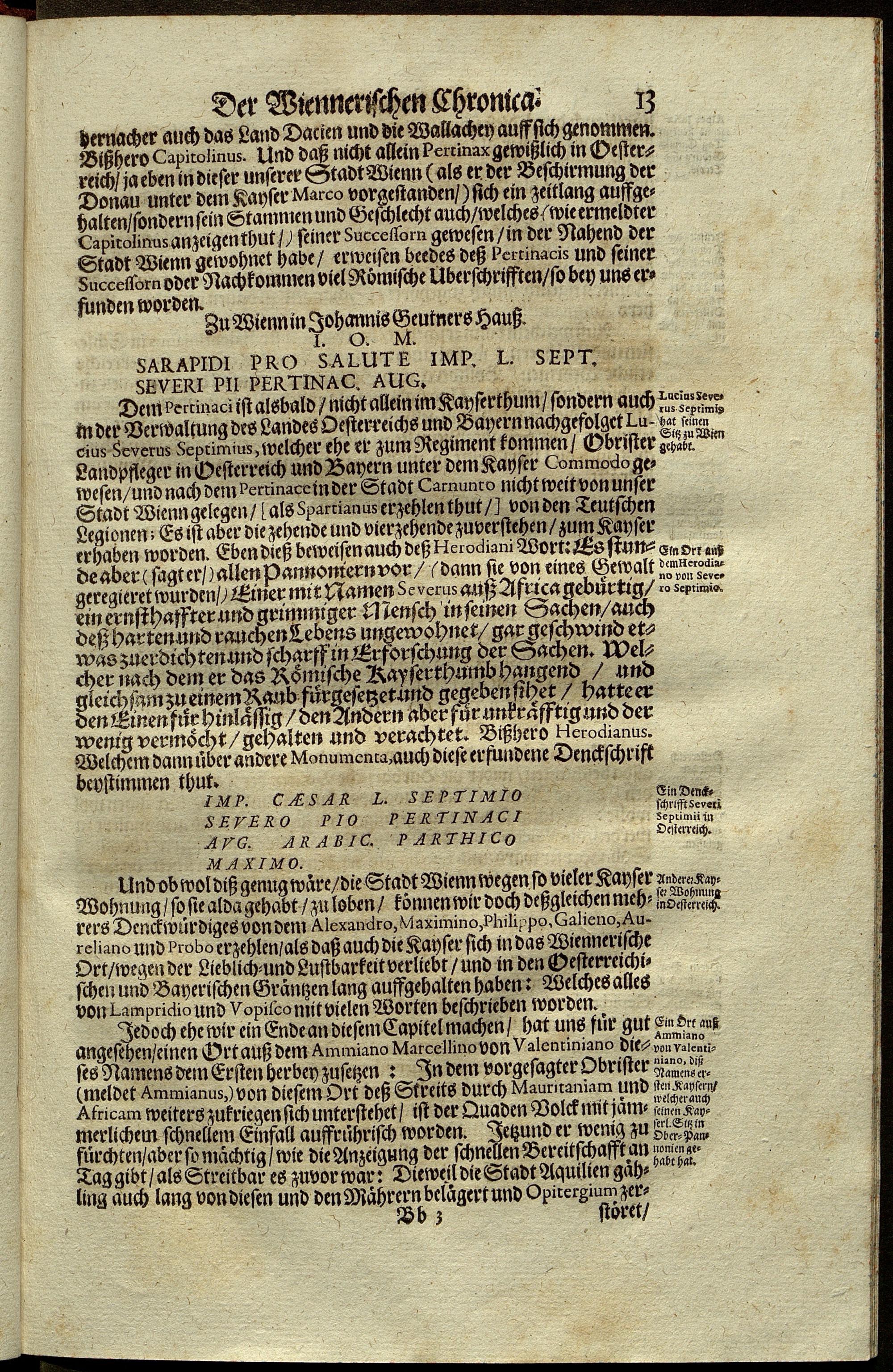 Chronica oder Historische Beschreibung der Weitberühmten Kayserlichen Hauptstadt Wienn in Oesterreich : Darinnen derselben Ursprung, Adel, Obrigkeit und Geschlechter außführlich erklärt werden auch sonst viel remerquable Sachen begriffen ; in vier Bücher verfasset / durch Wolffgang Lazium ... in Latein verfaßt : Und hernach in die Hoch-Teutsche Sprach versetzet durch Henricvm Aberman