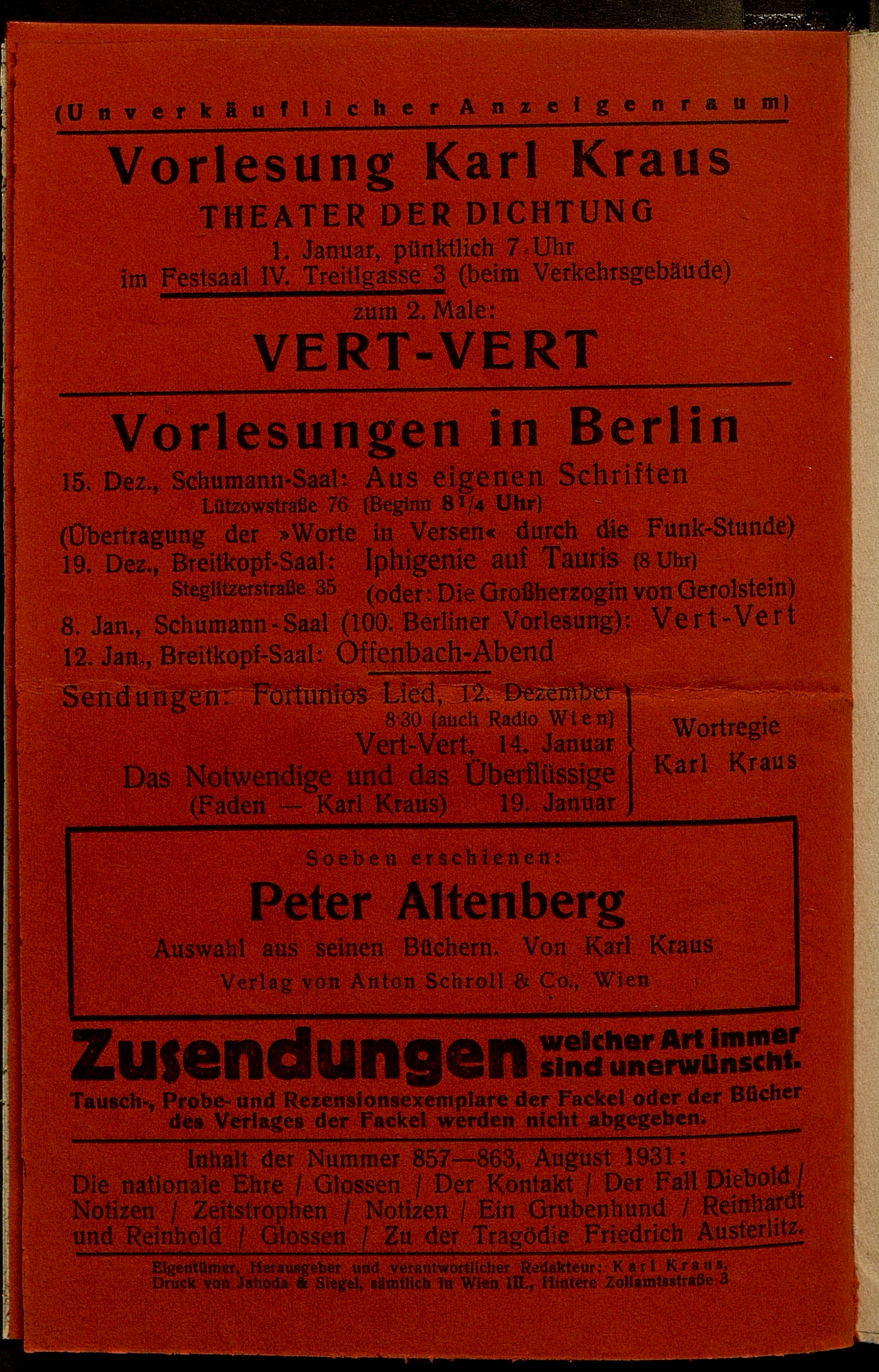 Korrekturen des letzten Umbruches und des Umschlages zur Fackel Nr. 864/867