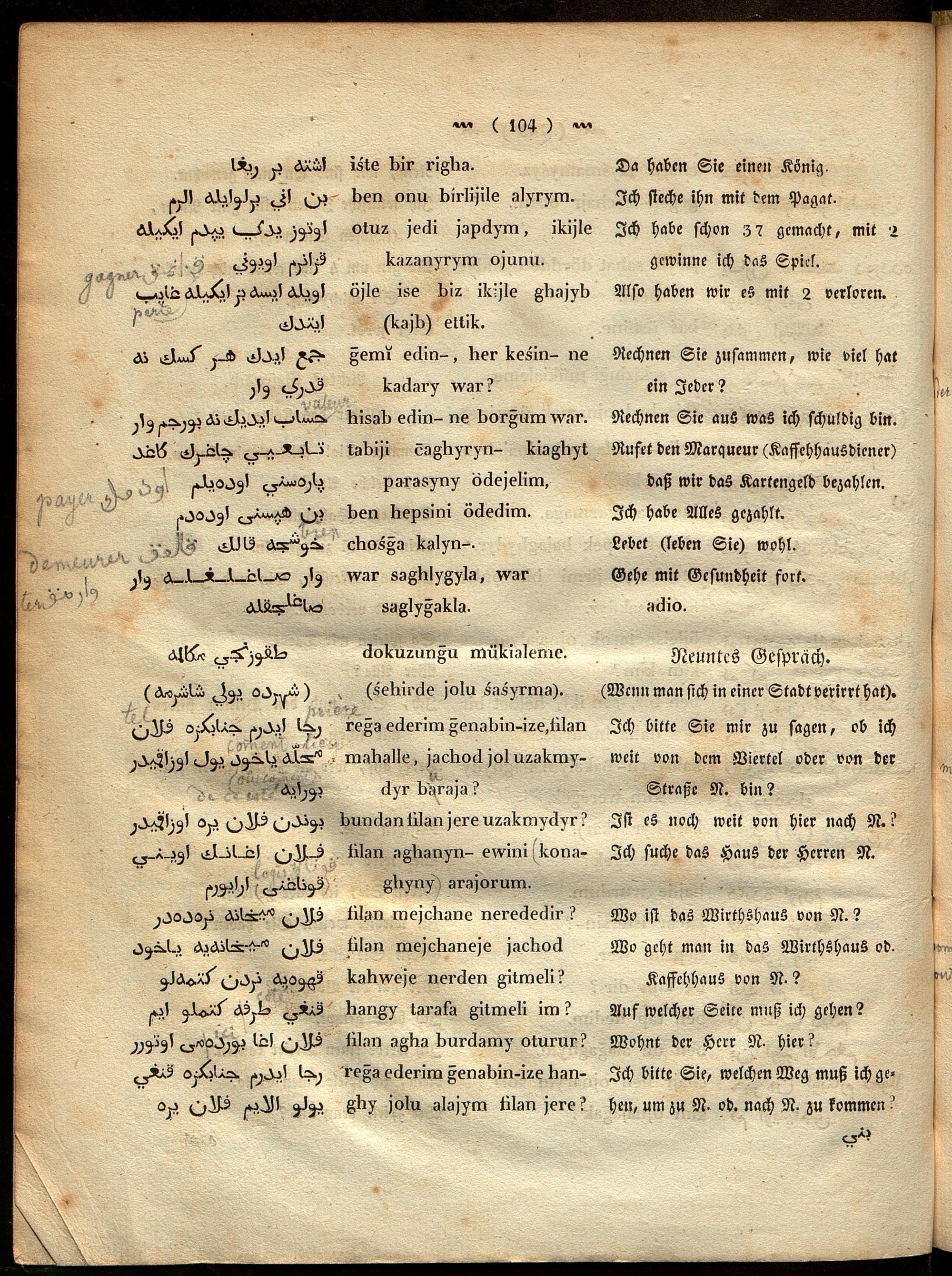 Theoretisch-pracktische türkische Sprachlehre für Deutsche : mit einer Auswahl der nothwendigen Gespräche, Leseübungen und einem deutsch-türkischen und türkisch-deutschen Wörterbuch nebst dem alphabetisch geordneten Verzeichnisse der Aussprache mit lateinischen Buchstaben für jene, die Türkisch nicht lesen können oder es nicht lernen wollen / von Artin Hindoglu aus Kiutahie in Kleinasien Lehrer der türkischen Sprache