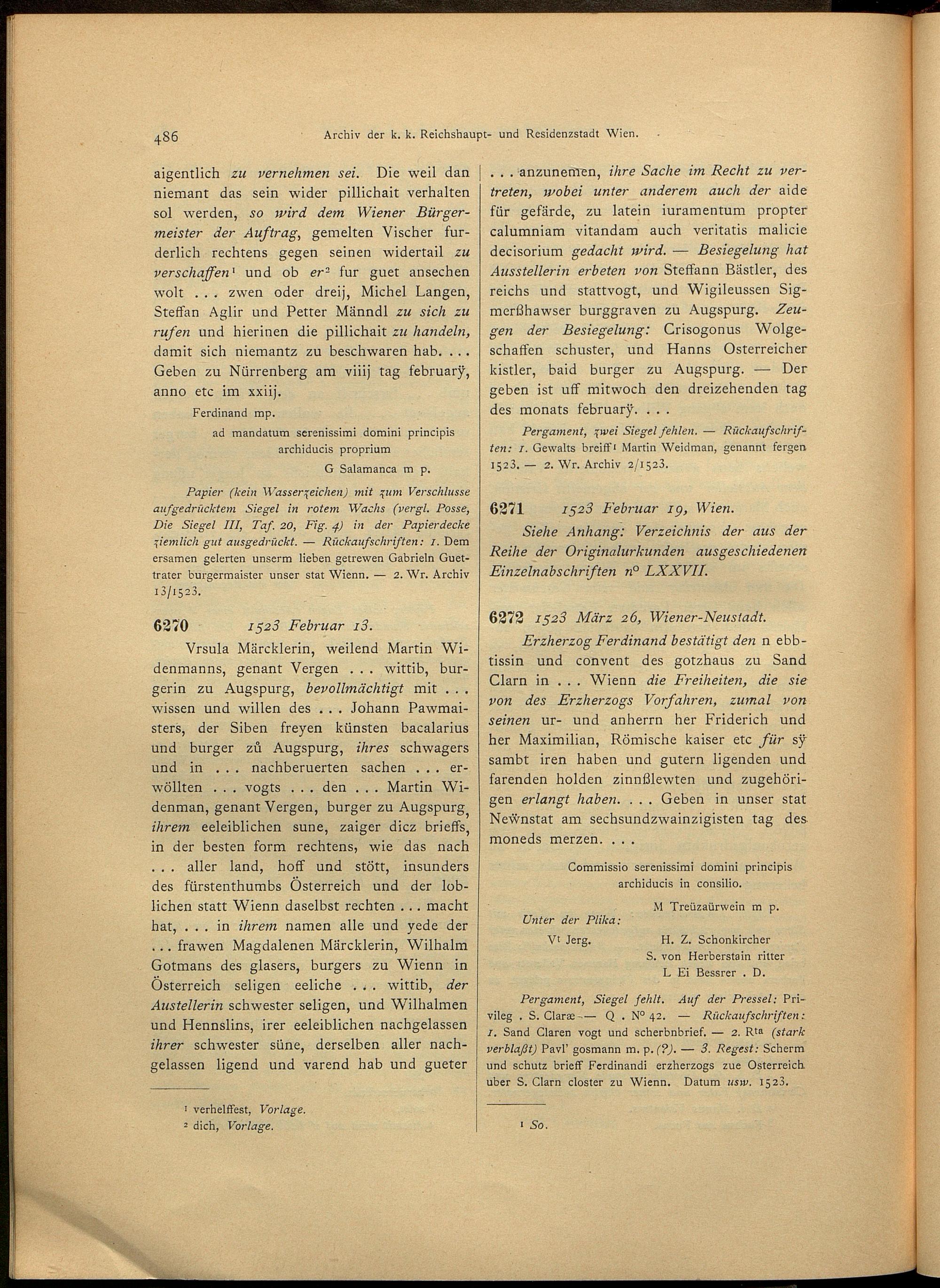 2,4,1 (1917) Verzeichnis der Originalurkunden des Städtischen Hauptarchives 1494 - 1526. - 1. Halbbd. / bearb. von Josef Lampel / hrsg. vom Verein für Geschichte der Stadt Wien (früher Altertums-Verein zu Wien)