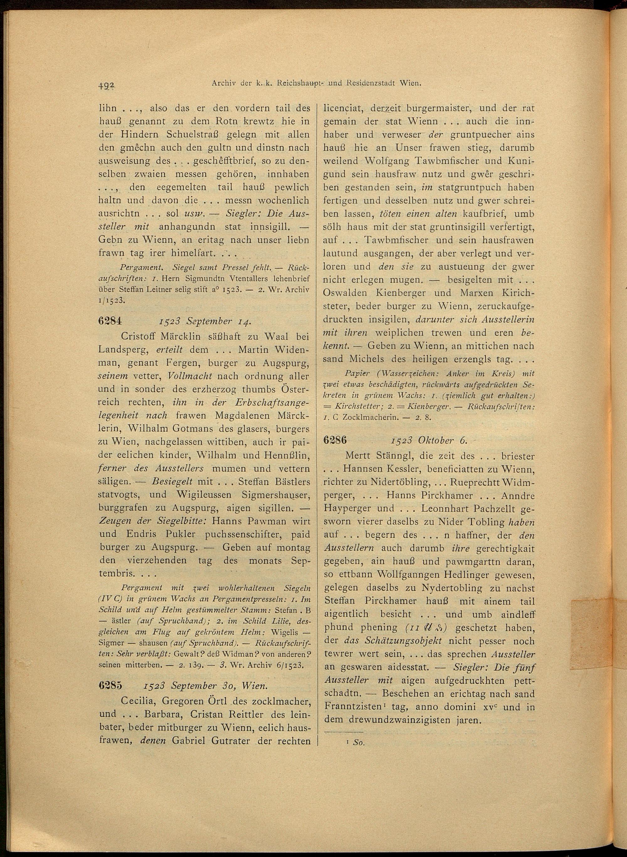 2,4,1 (1917) Verzeichnis der Originalurkunden des Städtischen Hauptarchives 1494 - 1526. - 1. Halbbd. / bearb. von Josef Lampel / hrsg. vom Verein für Geschichte der Stadt Wien (früher Altertums-Verein zu Wien)
