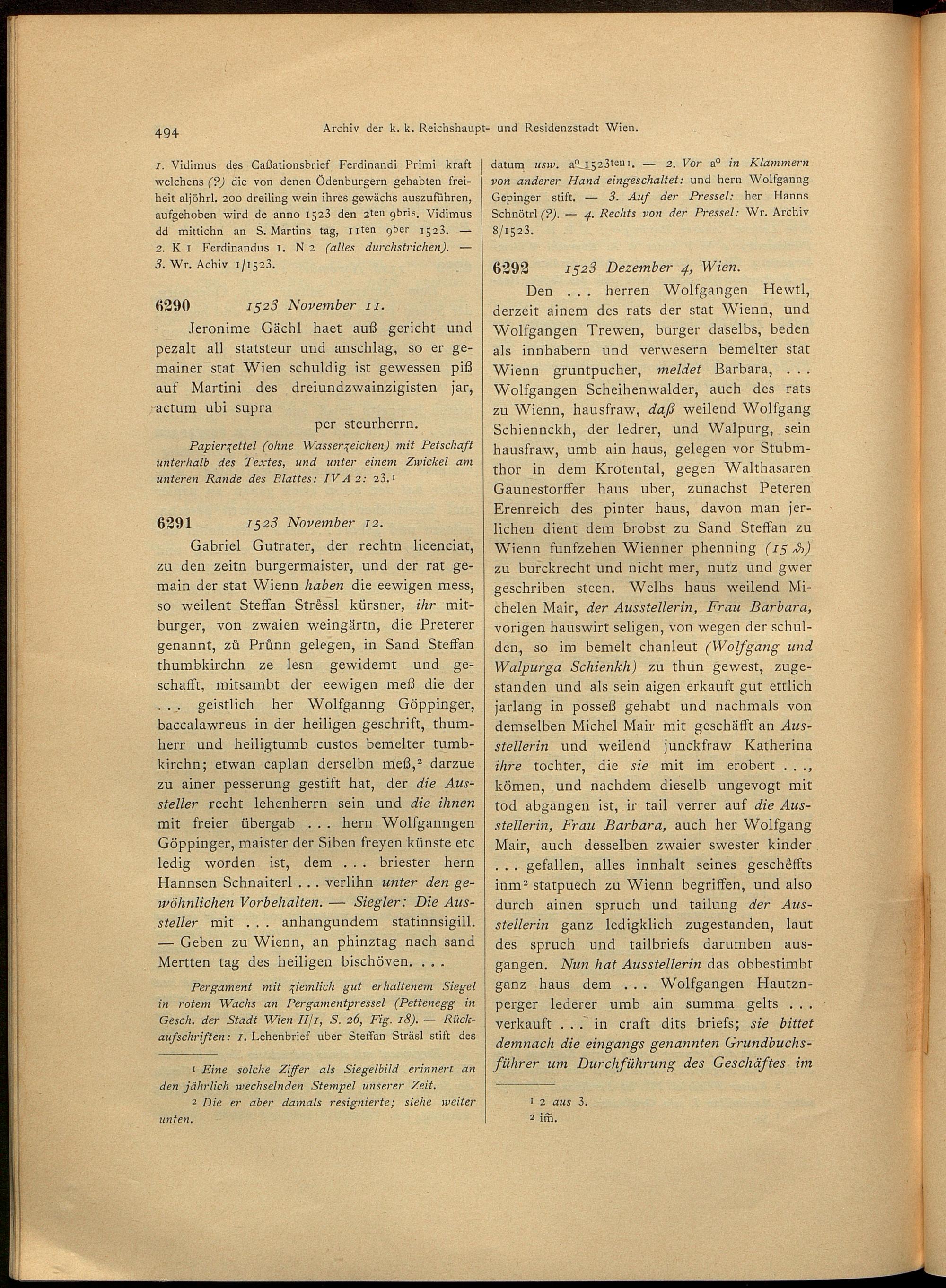 2,4,1 (1917) Verzeichnis der Originalurkunden des Städtischen Hauptarchives 1494 - 1526. - 1. Halbbd. / bearb. von Josef Lampel / hrsg. vom Verein für Geschichte der Stadt Wien (früher Altertums-Verein zu Wien)