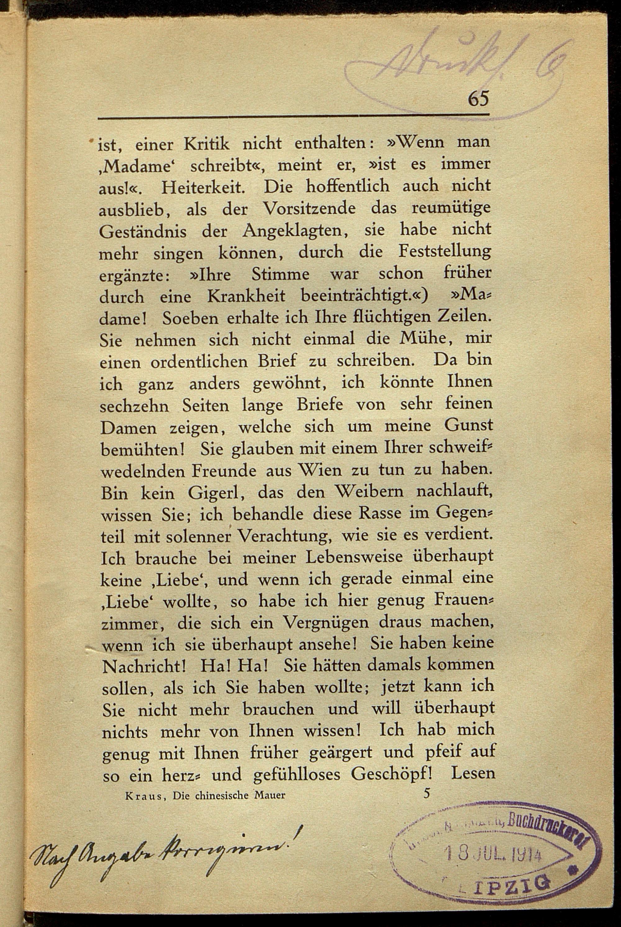 Korrekturbögen zur zweiten Ausgabe der Essay-Sammlung "Die chinesische Mauer"