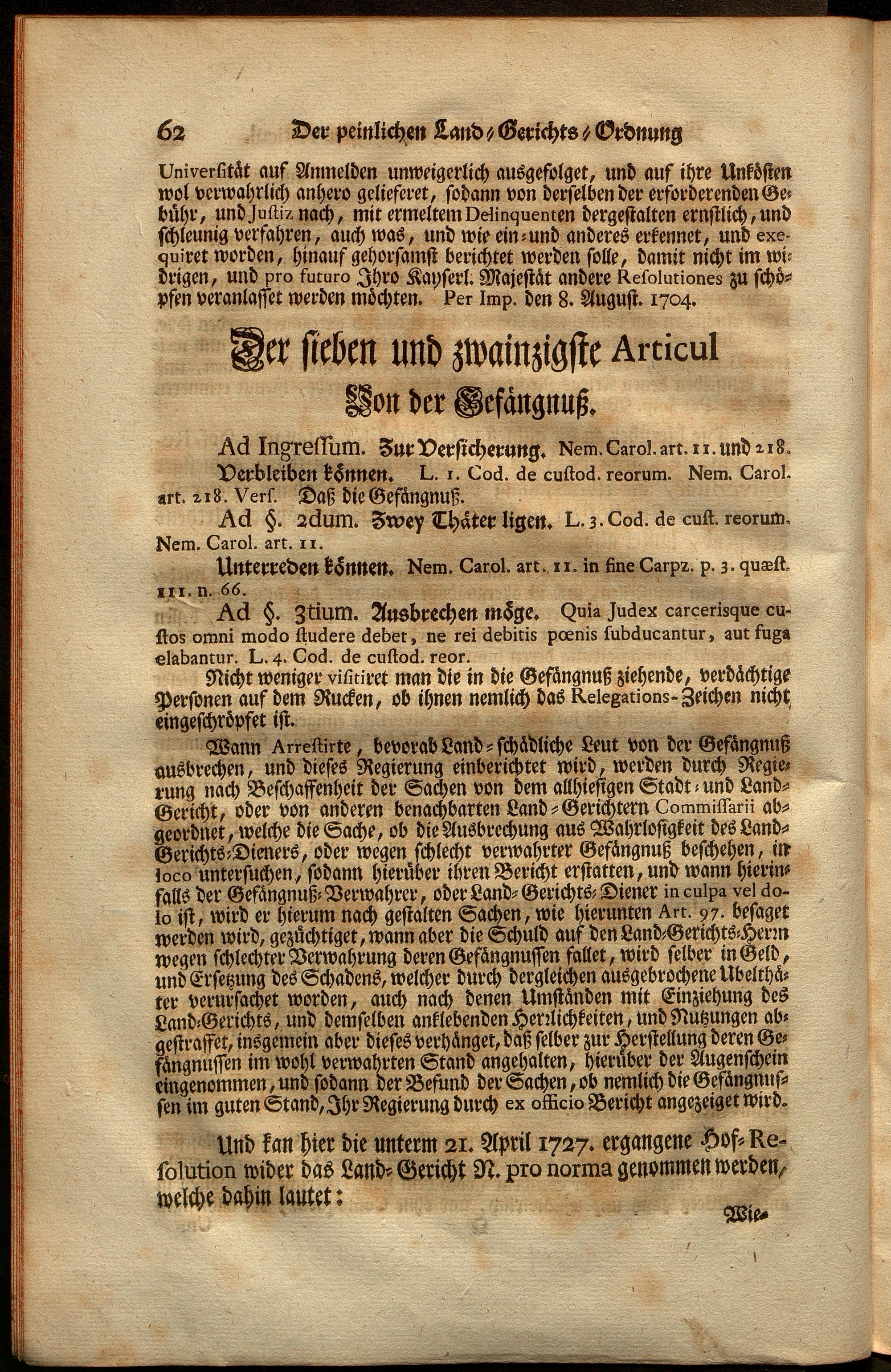 Uber Weiland Der Römisch-Kayserlichen, Auch Zu Hungarn, und Böheim u. Königl. Majestät Ferdinandi Des Dritten, Erz-Herzogens zu Oesterreich, Allerseligsten Andenckens, Peinliche Land-Gerichts-Ordnung In Oesterreich unter der Enns, : ersten und anderten Theil dienliche Anweisungen, und nutzliche Anmerckungen, wie auch alle hierüber weiters ergangene Hof-Resolutionen, Patenten, Generalien, und Novellen, dann verschiedene Praejudicien und Entscheidungen deren in Criminalibus vorfallenden zweifelhaften Fragen nach denen Articulen in der Ordnung eingetheilet und zusammen getragen... samt einem ausführlichen Register über alle hierinnen vorkommende Materien / Franz Joseph Bratsch, ...
