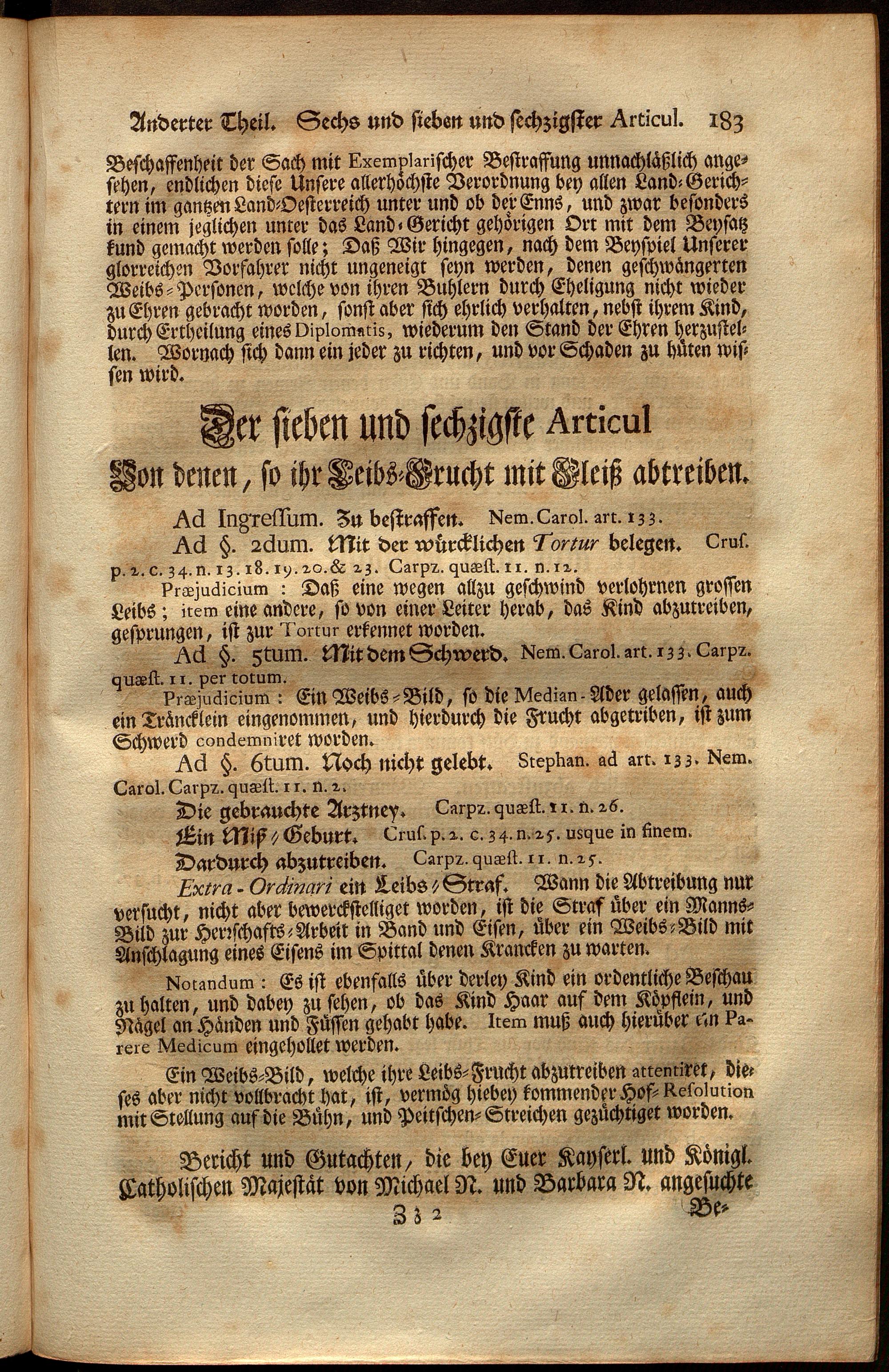 Uber Weiland Der Römisch-Kayserlichen, Auch Zu Hungarn, und Böheim u. Königl. Majestät Ferdinandi Des Dritten, Erz-Herzogens zu Oesterreich, Allerseligsten Andenckens, Peinliche Land-Gerichts-Ordnung In Oesterreich unter der Enns, : ersten und anderten Theil dienliche Anweisungen, und nutzliche Anmerckungen, wie auch alle hierüber weiters ergangene Hof-Resolutionen, Patenten, Generalien, und Novellen, dann verschiedene Praejudicien und Entscheidungen deren in Criminalibus vorfallenden zweifelhaften Fragen nach denen Articulen in der Ordnung eingetheilet und zusammen getragen... samt einem ausführlichen Register über alle hierinnen vorkommende Materien / Franz Joseph Bratsch, ...