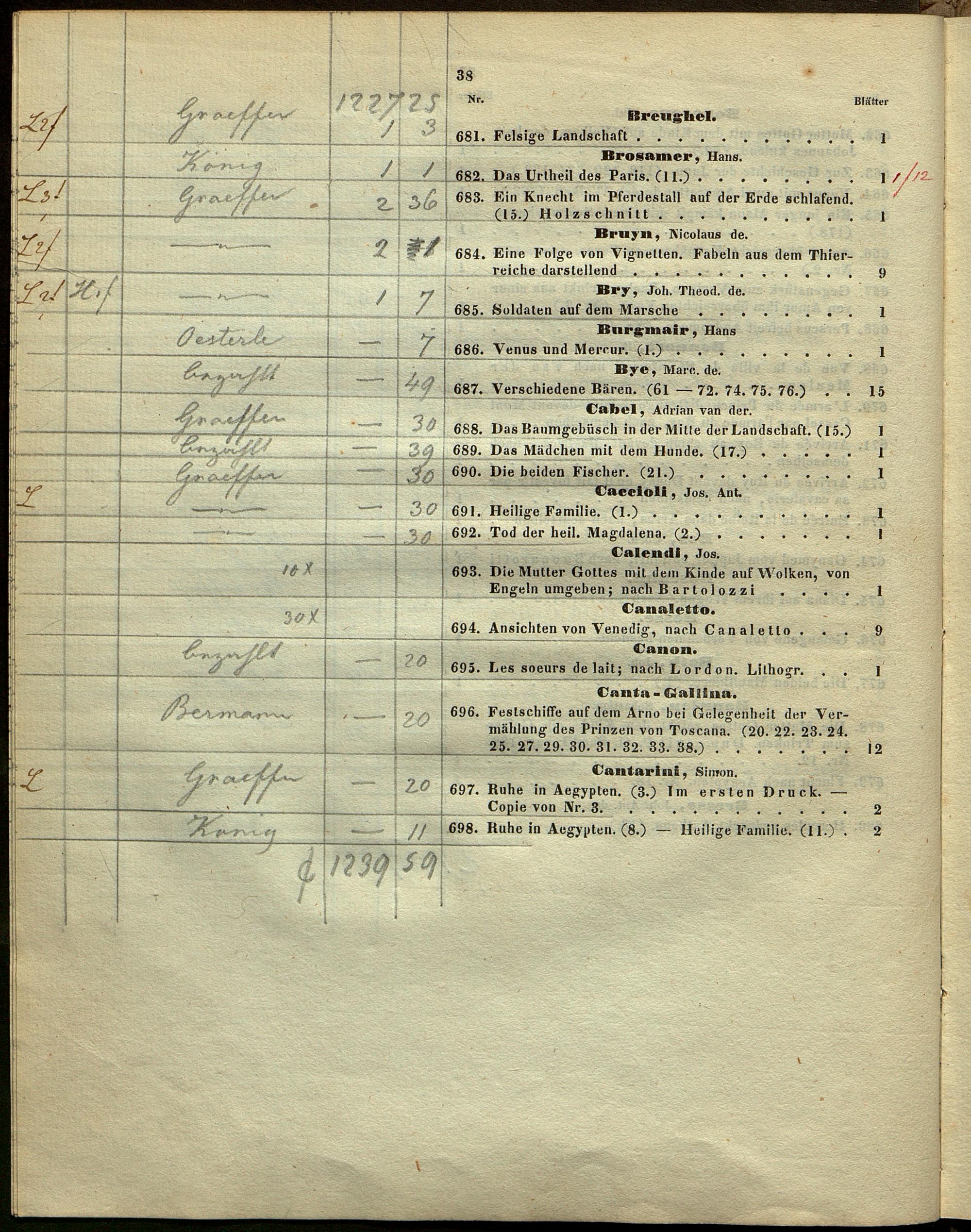 Verzeichniß von Kunstwerken, Büchern, Landkarten und Plänen, nebst einer Sammlung von Kupferstichen und Radirungen alter und neuer Meister, welche den ... December 1843 und folgende Tage in Wien, am Kohlmarkt Nr. 1151, im 2. Stock, durch die Kunsthandlung Artaria & Compagnie, öffentlich versteigert werden