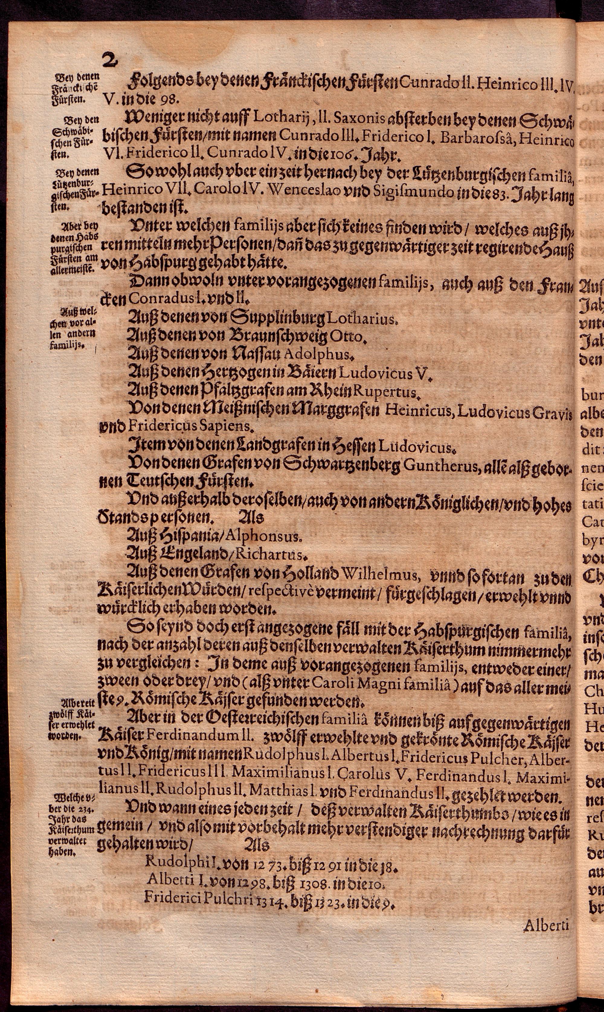 Vier Unterschiedliche Relationes Historicæ : I. Welcher massen die zu gegenwertiger Zeit Regirende Käiser: auch zu Hungarn und Boheim koniglichen Majestät, für sich und deroselben nechste Blutsverwante zwey und dreyssig Römische Käiser titulo Parentum Zu Voreltern erlangt habe. II. Durch was mittel das Hochlöbliche Hauß der Ertzhertzogen Zu Österreich, zu so viel Land und Leüten gelangt. III. Was seithero Caroli Magni Zeiten zu und von dem Reich kommen und biß auf dato dabey verblieben. IV. Welcher gestalt die zu gegenwertige Zeit lebende Europaeische Christliche König, Chur und Fürsten deß Reichs vorgedachten Hochl: Hauß der Ertzhertzogen zu Österreich verwandt sein: Und welcher massen ihrer samtlichen Genealogia Materno genere auf Rudolphum I. Röm: Kaiser, und andere Österreichische Herrn gebracht werden könne / Gestellt durch Leonhart Wurfbain. Burgern und der Rechten Doctorem in Nürnberg