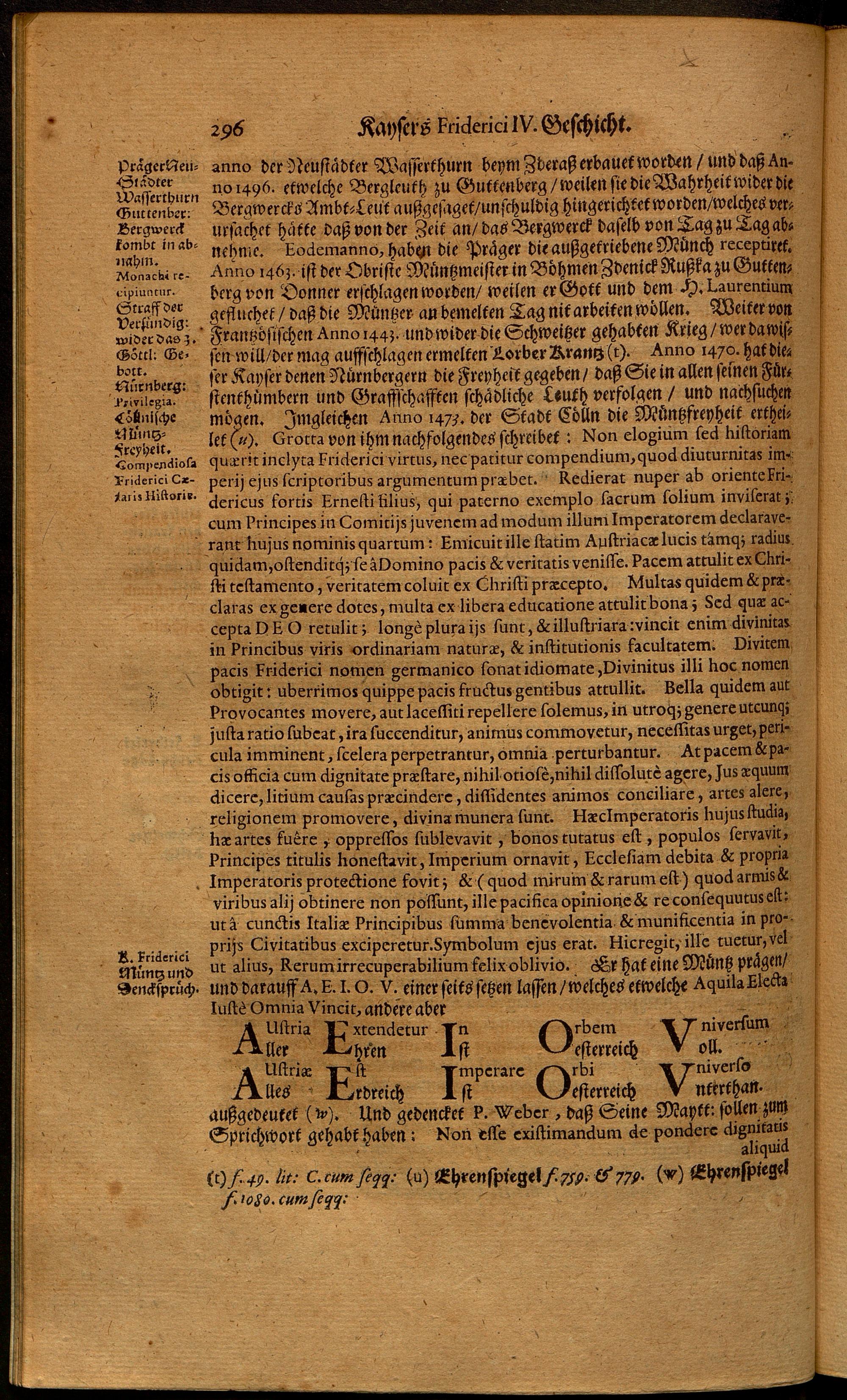 Fürsten-Spiegel, Oder Monarchia Deß Hochlöblichen Ertz-Hauses Oesterreich : Worinnen Im Ersten Theil Nit allein alle Römische Kayser und Könige von Rudolpho I. sondern auch alle Hertzog-ErtzHertzog- und Graffen auß dem Hochlöblichen Ertz-Hauß Oesterreich, so viel deren bißhero von denen Historicis vorgebracht worden, bieß auff die jetzt Glorwürdig Regierende Maytt: Leopoldum I. Was vor Röm: Päbste in ein- und anderer Herrschung gefolget, Alle Böhmische, Polnisch- und Hungarische respectivè Hertzog- und Könige, Türckische Kayser, unterschiedliche Hertzoglich, Fürstlich, Gräfflich, Freyherrlich, und andere Hoch- und Adeliche Häuser; Unterschiedliche Extracten auß mannigfältigen Chronicis und merckwürdige Antiquitäten; Alle des Hochlöbl: Ertz-Hauses, Erb-Königreiche, und andere Lande. Im Andern Theil Alle An Ihro Kayserlichen Majestät Leopoldo Per Metamorphosim lebhafft gemachte Hertzog, ErtzHertzog, und Röm: Kayser aus dem Hochlöbl: Ertz-Hauß Oesterreich, Wie auch alle aus diesem Hochlöbl: ErtzHauß Römische Kayserin, Hertzog- und Hertzoginne, und wie diese vermählet worden; von denen die Posterität bieß auff diese Zeit annoch lebet, mit Nahmen benennet; Wie ingleichen alle Römische Kayser, von Julio Caesare an, biß auff hochermeldten Kayser Rudolphum I. mit Ihren Geschichten compendiosè eingeführet, und von vielfältigen alt- und neuen approbirten Scribenten, mit einem außführlichen Register auß- und zusammen gezogen / Durch Johann Jacob von Weingarten