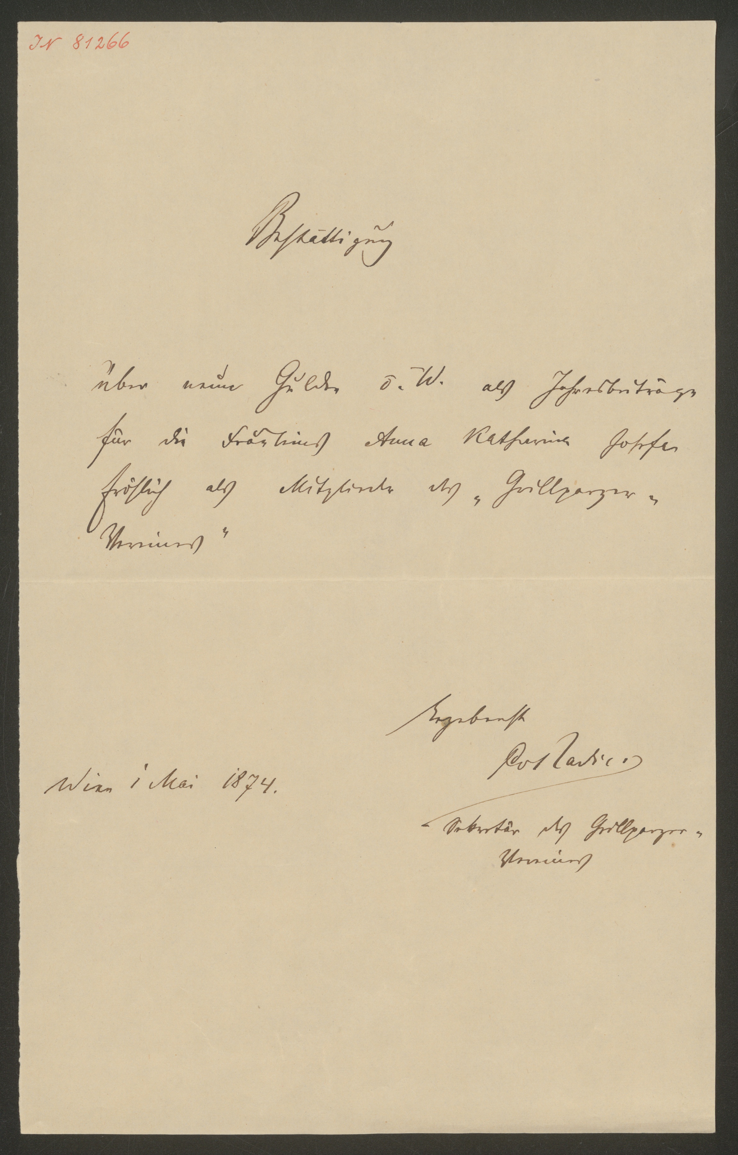 Bestätigung über 9 Gulden v. W. an die Schwestern Fröhlich als Jahresbeiträge für den Grillparzer-Verein