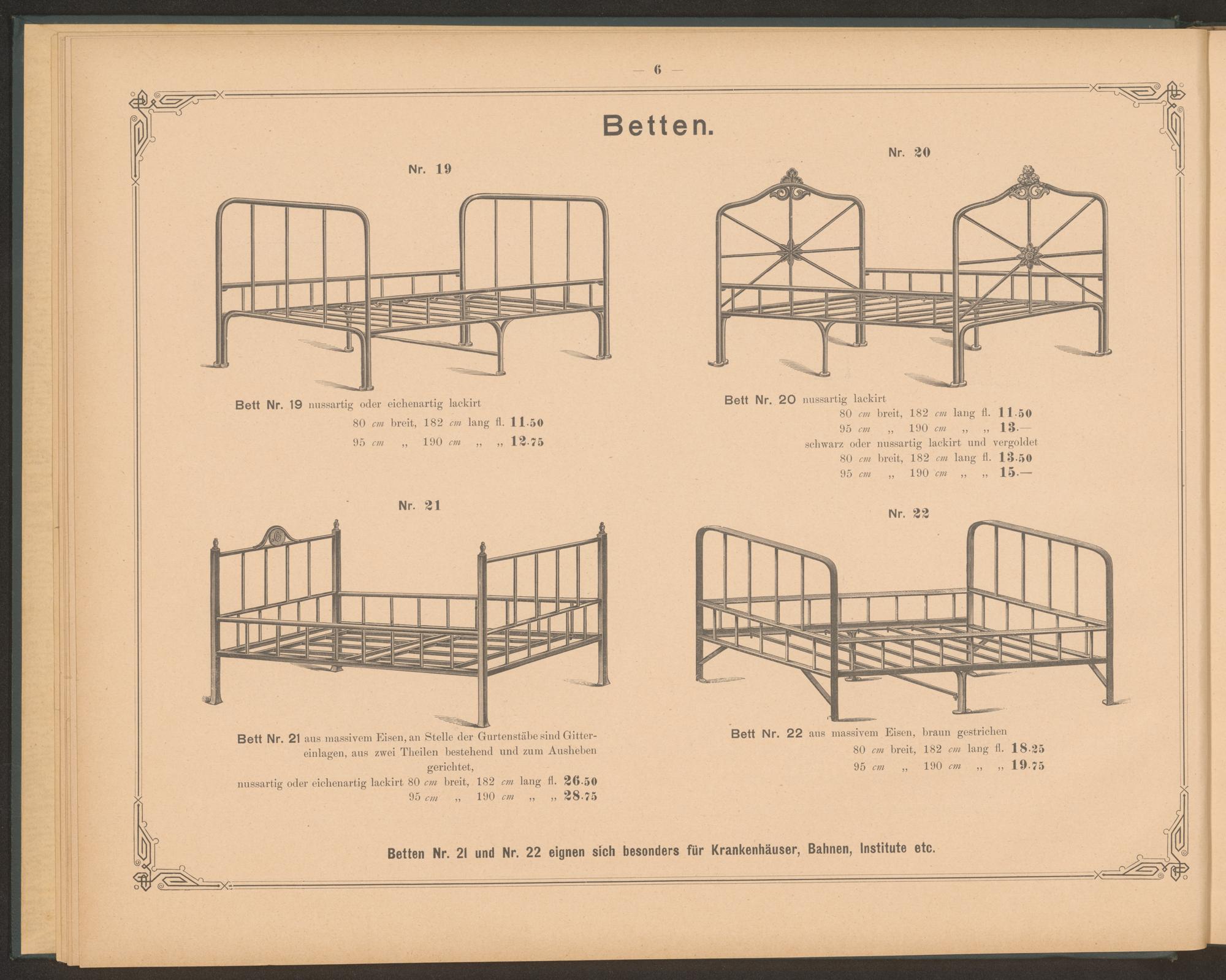 Preis-Courant der Eisenmöbel-Fabrik Sigm. Eisler, Wien, II. Untere Donaustraße No. 41 nächst der Aspernbrücke : Drahtmatratzen- und Krankenwagen-Fabrik : complete Einrichtungen für Hotels, Spitäler etc. : großes Lager aller Gattungen Zimmer- u. Gartenmöbel : über Messingbetten u. Messingmöbel separater Preis-Courant / Sigm. Eisler, Wien