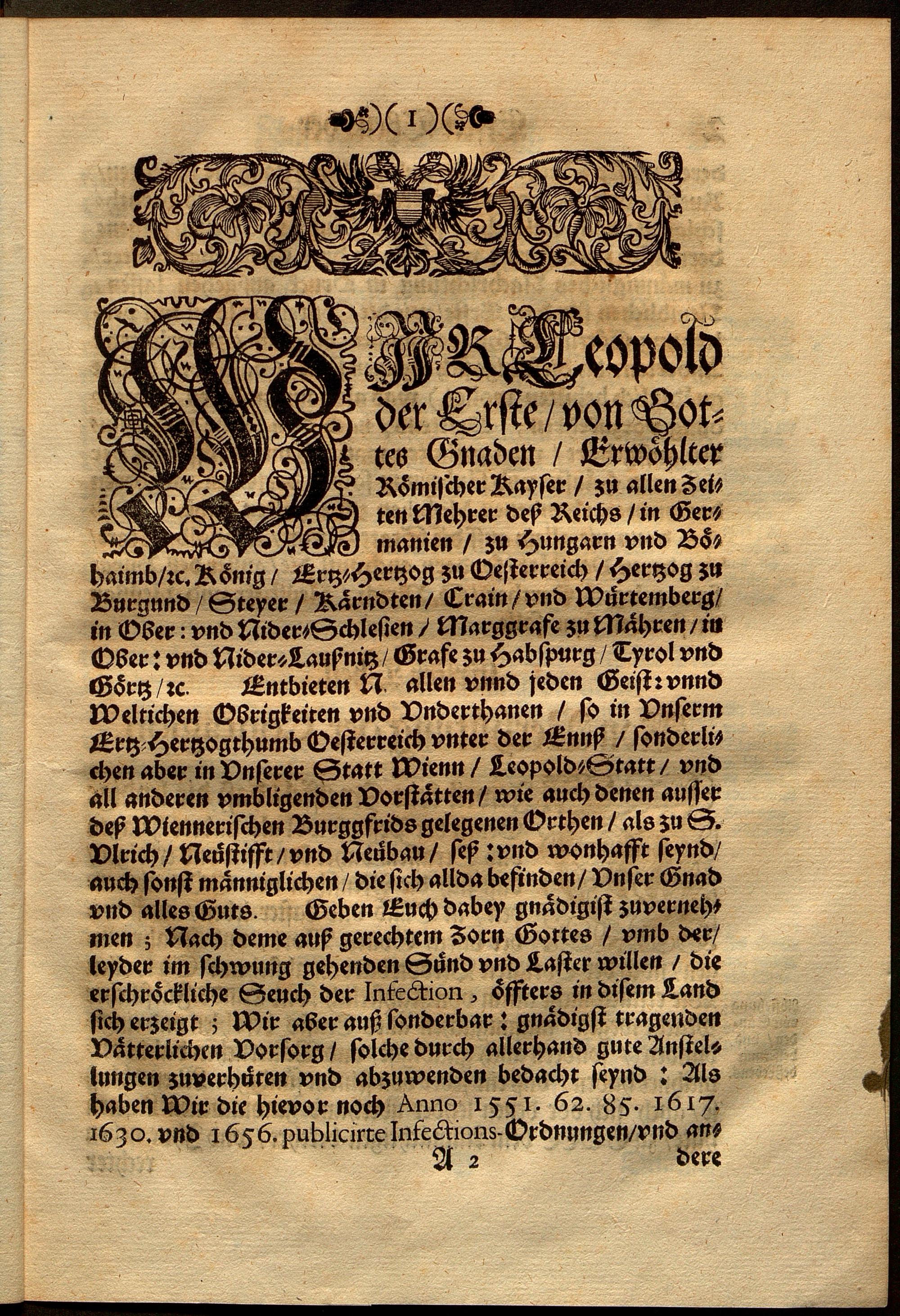 Der Römischen Kayserlichen, auch zu Hungarn und Böhaimb, [et]c. Königlichen Majestätt, Leopoldi Deß Ersten, [et]c. Ertz-Hertzogens zu Oesterreich, etc. Unsers Allergnädigsten Herrn, Neüe Infections-Ordnung : Wie es ins gemein in dero Haupt- und Residentz-Statt Wienn, Leopold-Statt, und all anderen umbligenden Vorstätten, wie auch denen ausser deß Wiennerischen Burgfrids gelegenen Orthen, als zu S. Ulrich, Neüstifft, Neübau, [et]c. in den Infections-Sachen zuhalten ; [Geben in Unserer Statt Wienn, den Neundten Januarij, im Sechzehenhundert, Neun und Sibentzigisten ... Jahr.]