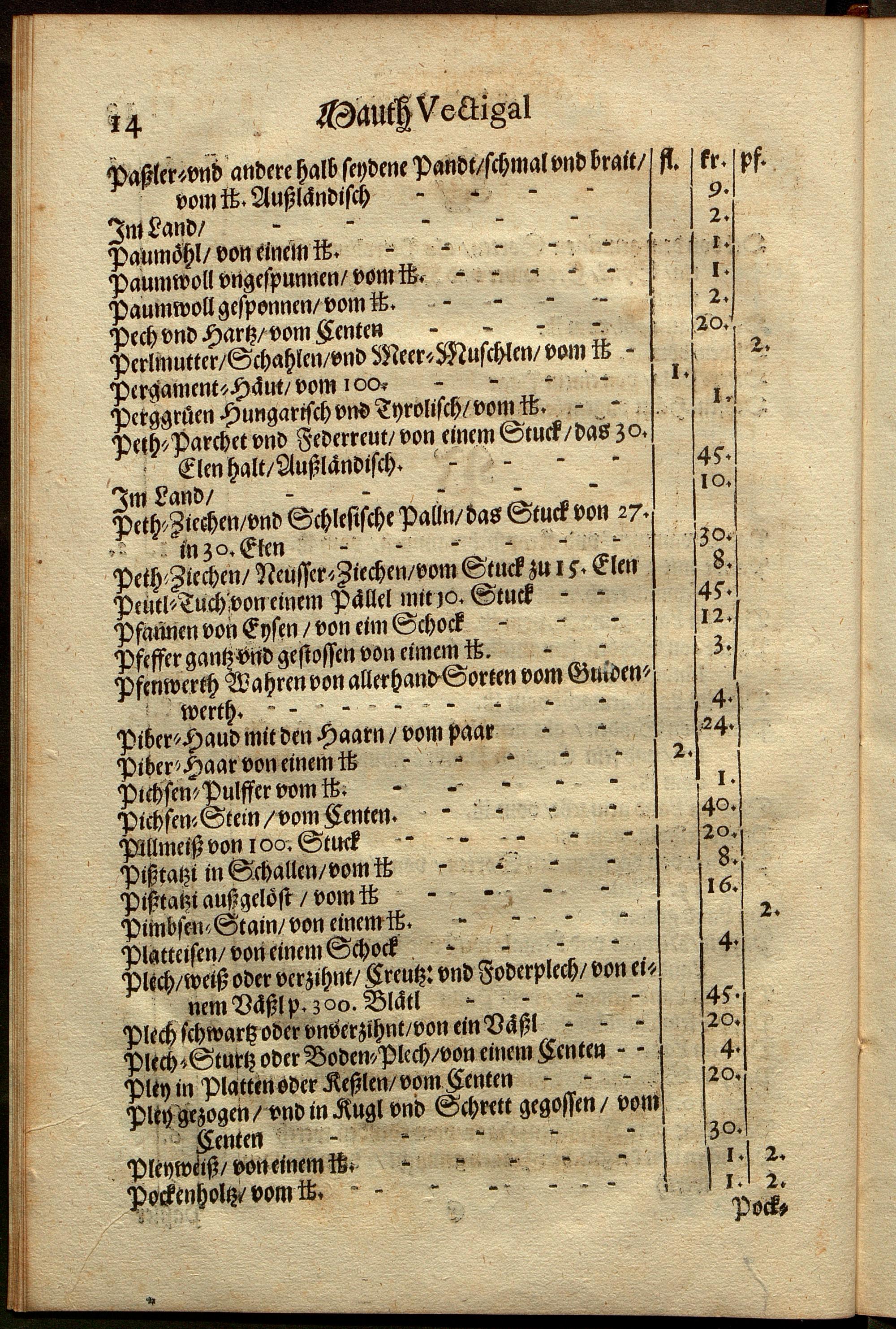 Vectigal und Mauth-Ordnung : so von der Röm. Kayserlichen auch zu Hungarn und Böhaimb Königl. Mayest. etc. Leopoldo Ertzherzogen zu Oesterreich ... vernewert worden, was nemblichen hinfueran von dem ersten April dieses lauffenden 1672isten. Jahrs anzufangen, auf allerhöchst ernent Ihrer Kayserlichen Mayestätt Mäuthern am Waag-Hauß allhier zu Wienn, auch andern Niederlags-Stätten, als Lintz, Crembs ... zur Mauth gegeben und bezahlt werden solle ; [Geben in Vnserer Statt Wienn, den Dreyssigisten Monaths-Tag Martij, im Sechzehenhundert Zwey vnd Sibentzigisten...]