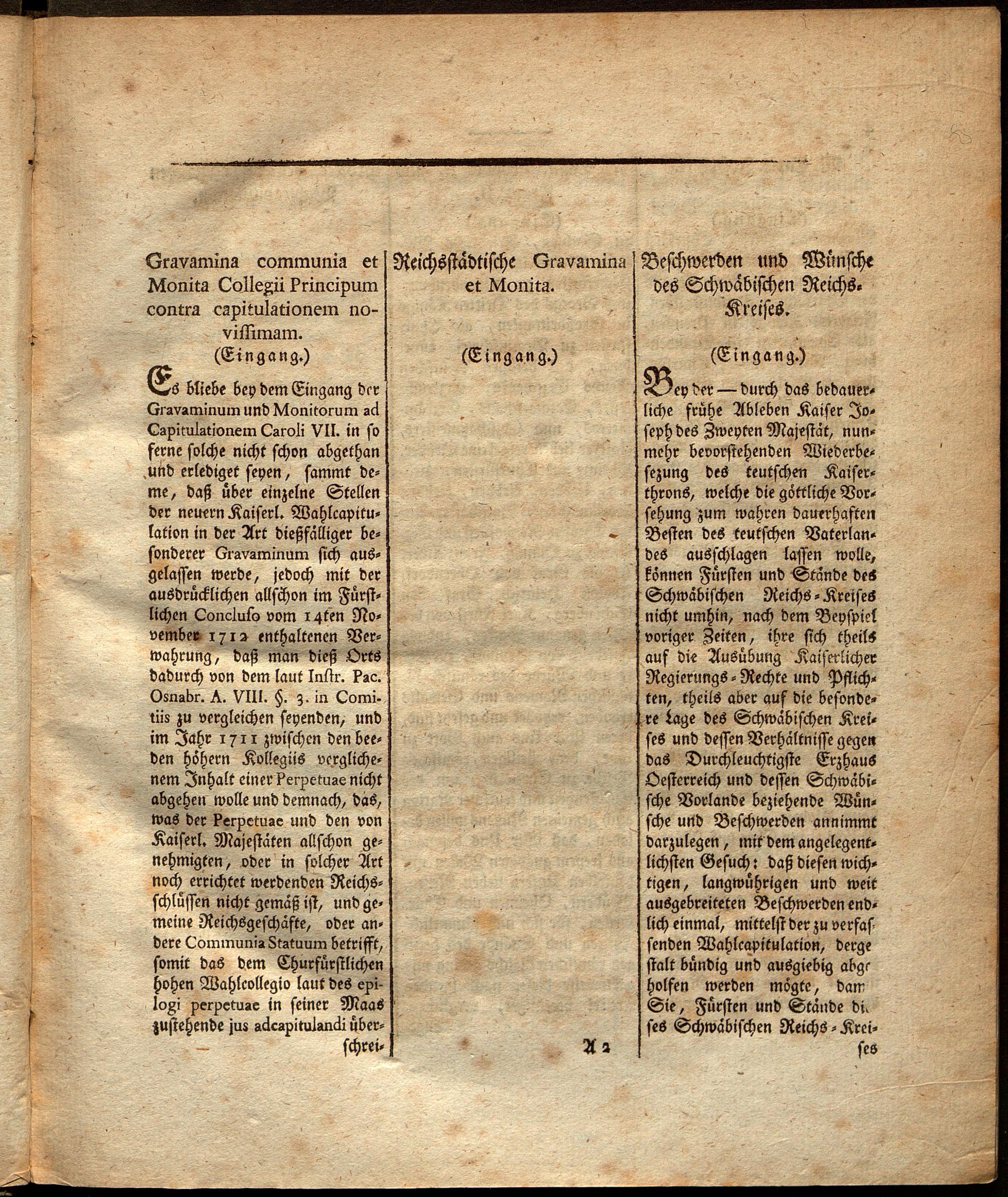 Wahlcapitulation Leopold II. und Franz II. verglichen mit ihren Quellen, nähmlich der beständigen, der vorhergehenden Joseph II. der Fürstlichen und Reichsstädtischen Gravaminibus und Montis, und den Beschwerden und Wünschen des Schwäbischen Reichskreises