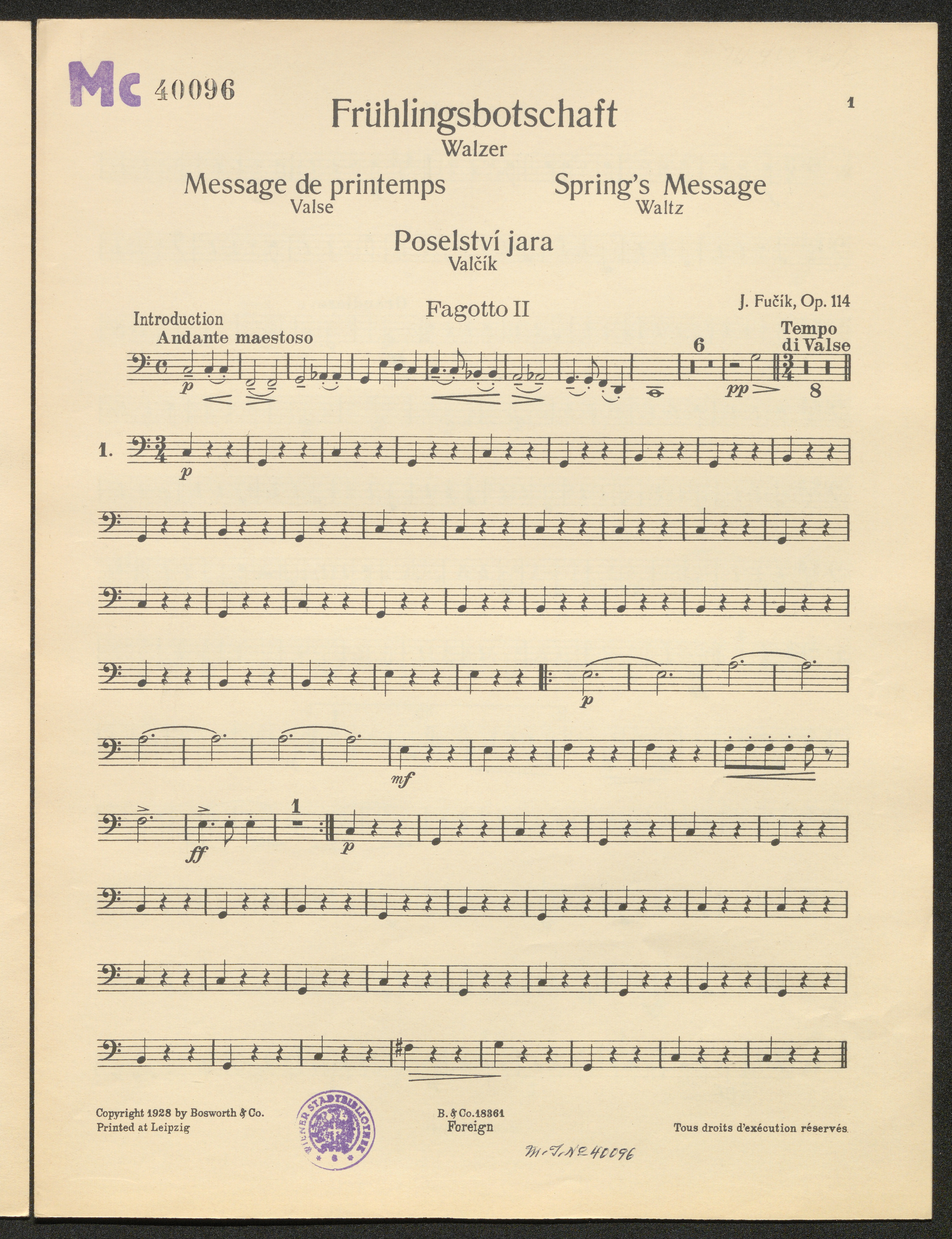 Frühlingsbotschaft : Walzer ; [für Streichorchester] ; op. 114 / [von] J. Fucik