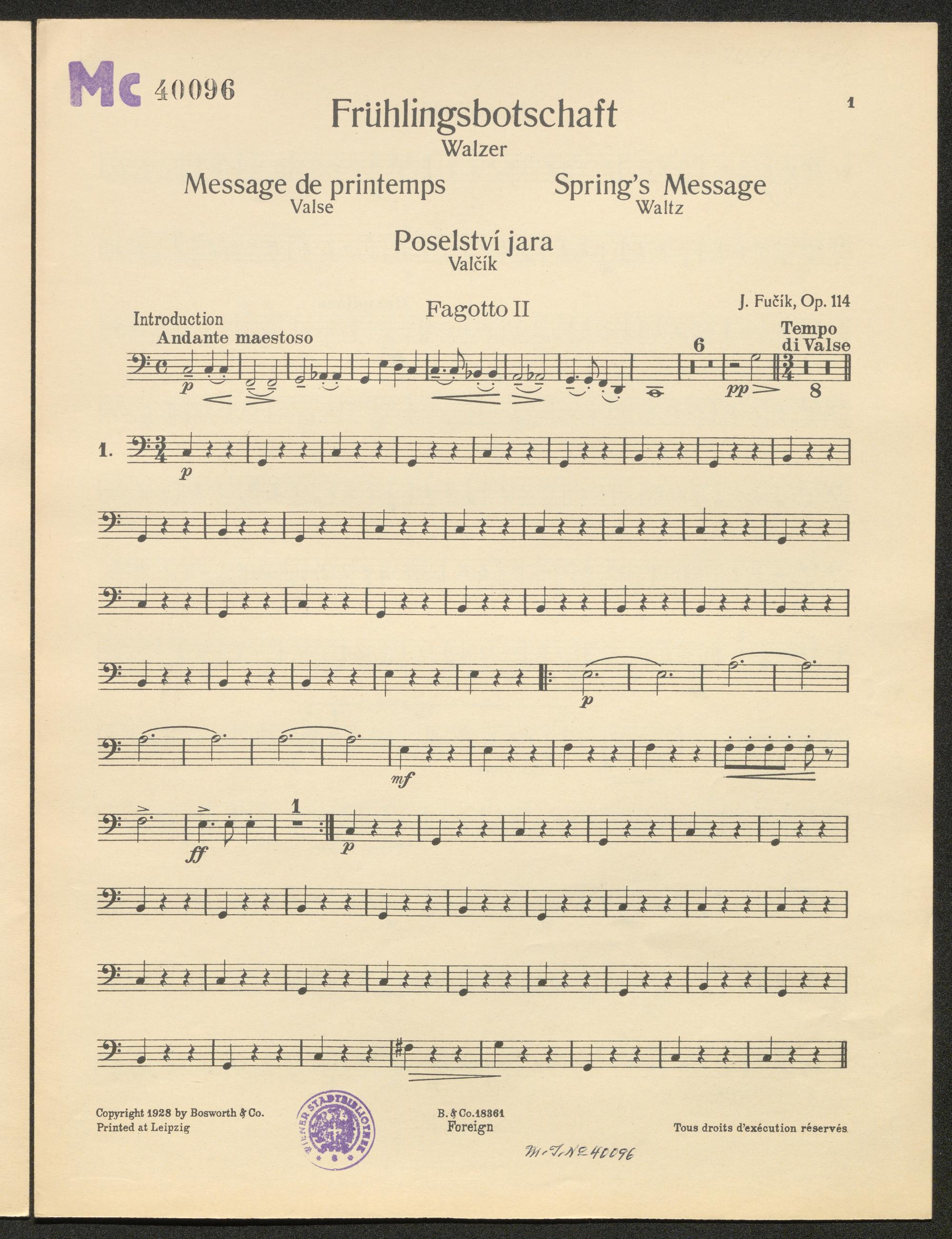 Frühlingsbotschaft : Walzer ; [für Streichorchester] ; op. 114 / [von] J. Fucik