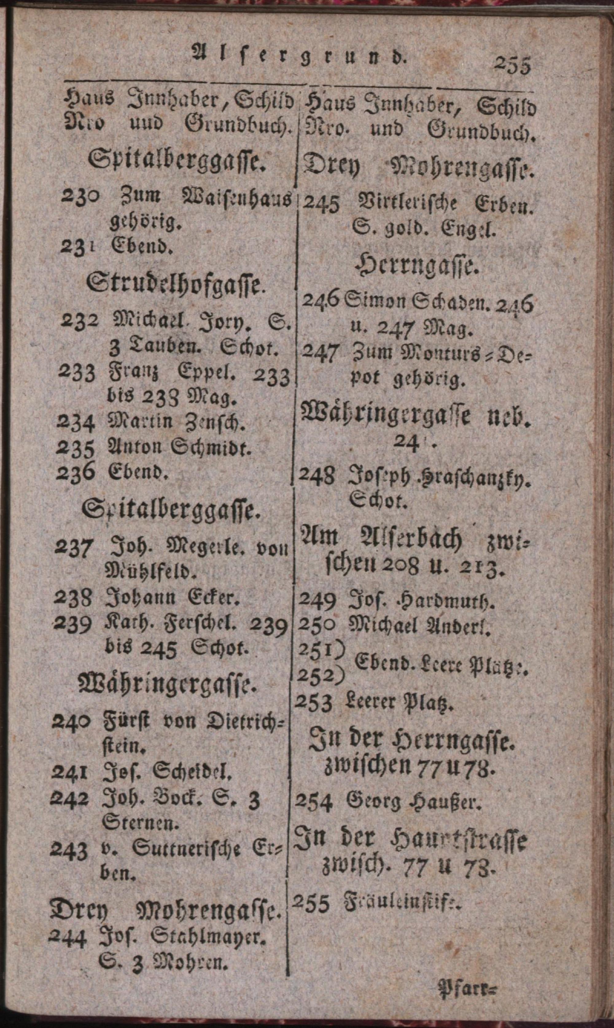 Vollständiges Verzeichniß aller in der k. k. Haupt- und Residenz-Stadt Wien inner denen Linien befindlichen numerirten Häuser deren Eigenthümer, Strassen, Gässen, Plätze, und Schilder / Verfaßt von Joseph Johann Grosbauer, Magistratischen Konscriptions- und Kundschafts-Koroberirungs-Amtskommissär