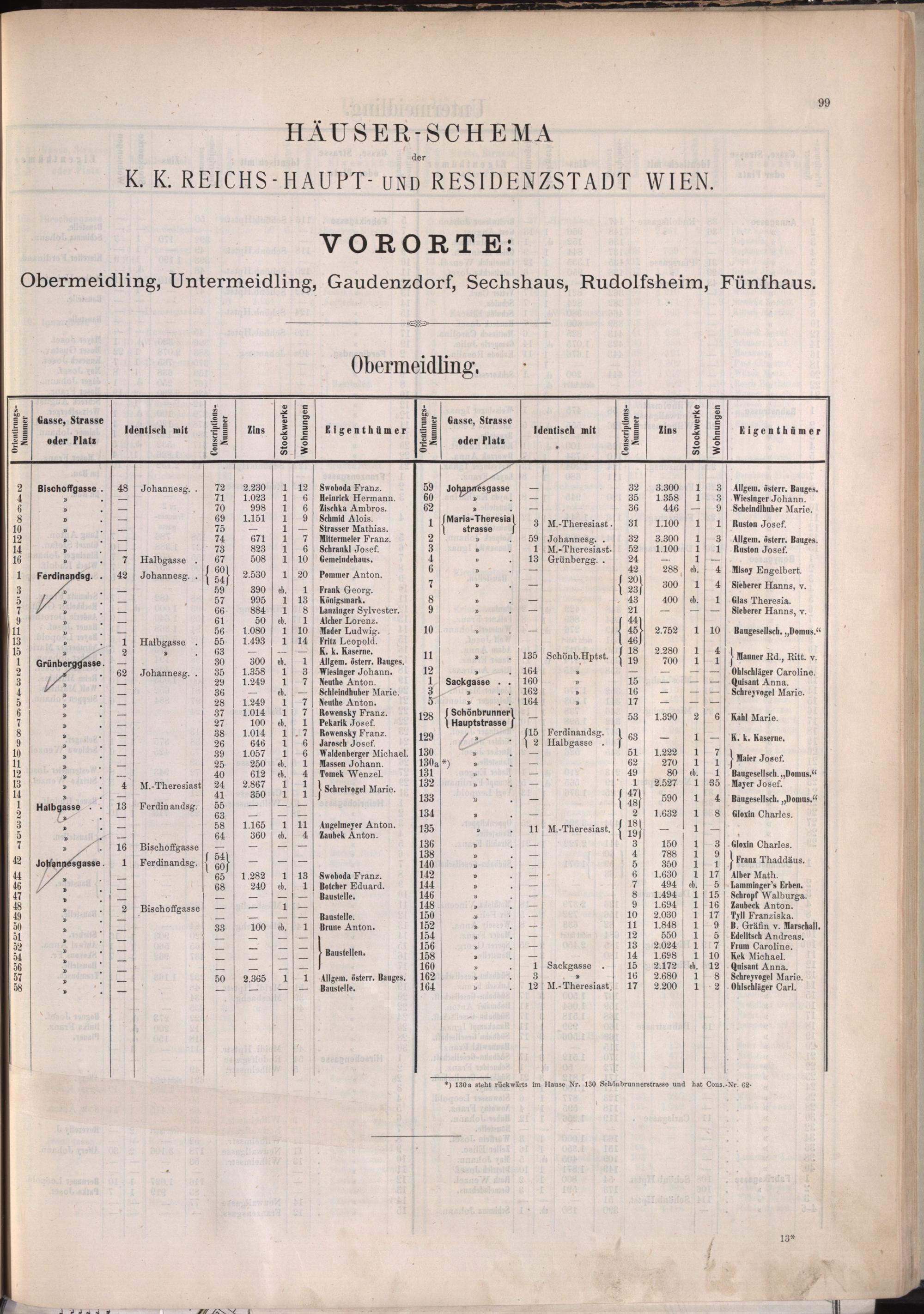 Häuser-Schema der K. K. Reichs-Haupt- und Residenzstadt Wien : mit deren zehn Bezirken und den Vororten Simmering, Untermeidling, Obermeidling, Gaudenzdorf, Fünfhaus, Sechshaus, Neulerchenfeld, Ottakring, Hernals, Währing, Weinhaus, Gersthof, Unterdöbling, Oberdöbling, Heiligenstadt, Nussdorf, Brigittenau, Zwischenbrücken, Schüttl, Kriau, Floridsdorf und die neuprojectirte Donaustadt in 15 Plänen / hrsg. von Peter Smöch