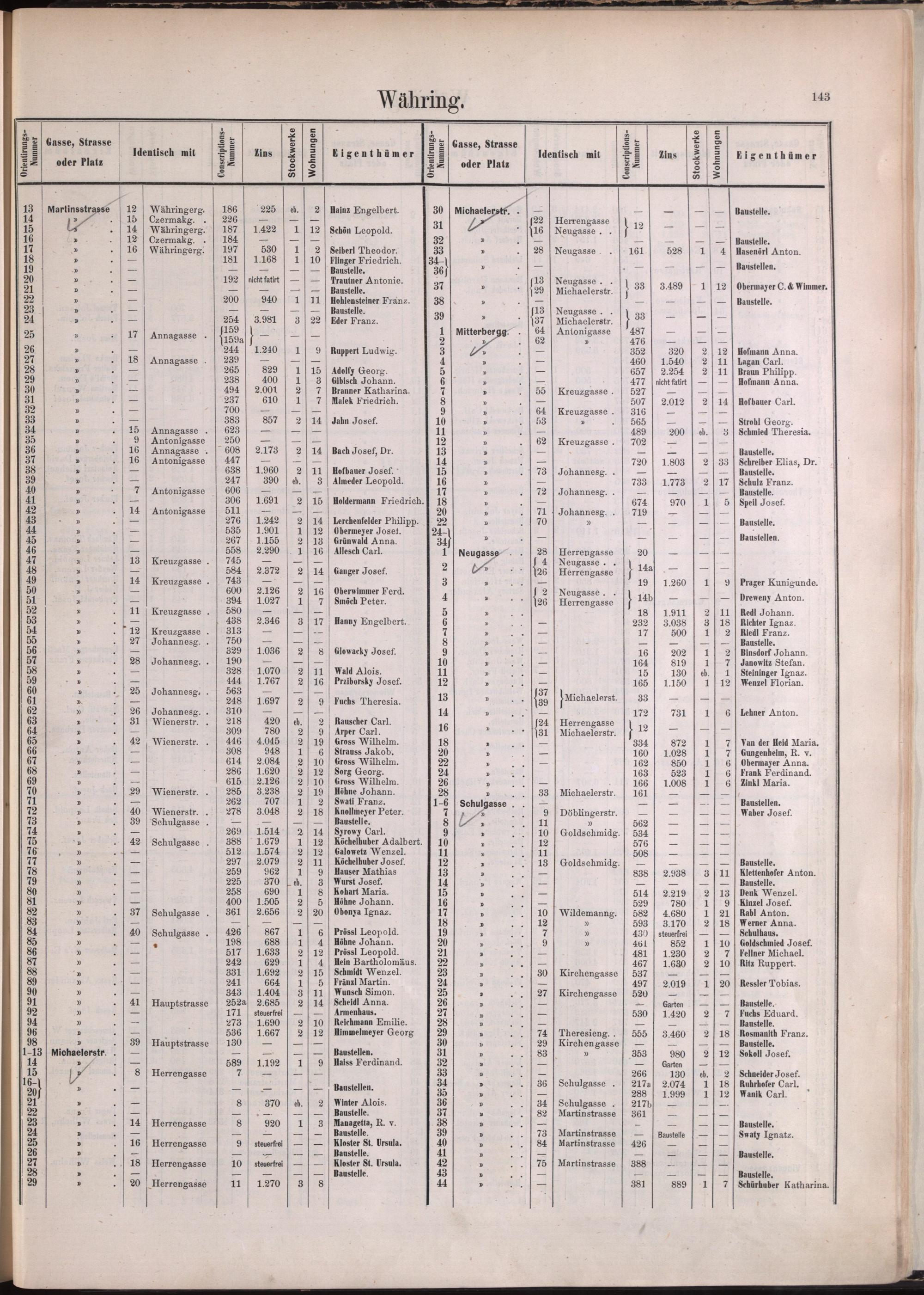 Häuser-Schema der K. K. Reichs-Haupt- und Residenzstadt Wien : mit deren zehn Bezirken und den Vororten Simmering, Untermeidling, Obermeidling, Gaudenzdorf, Fünfhaus, Sechshaus, Neulerchenfeld, Ottakring, Hernals, Währing, Weinhaus, Gersthof, Unterdöbling, Oberdöbling, Heiligenstadt, Nussdorf, Brigittenau, Zwischenbrücken, Schüttl, Kriau, Floridsdorf und die neuprojectirte Donaustadt in 15 Plänen / hrsg. von Peter Smöch