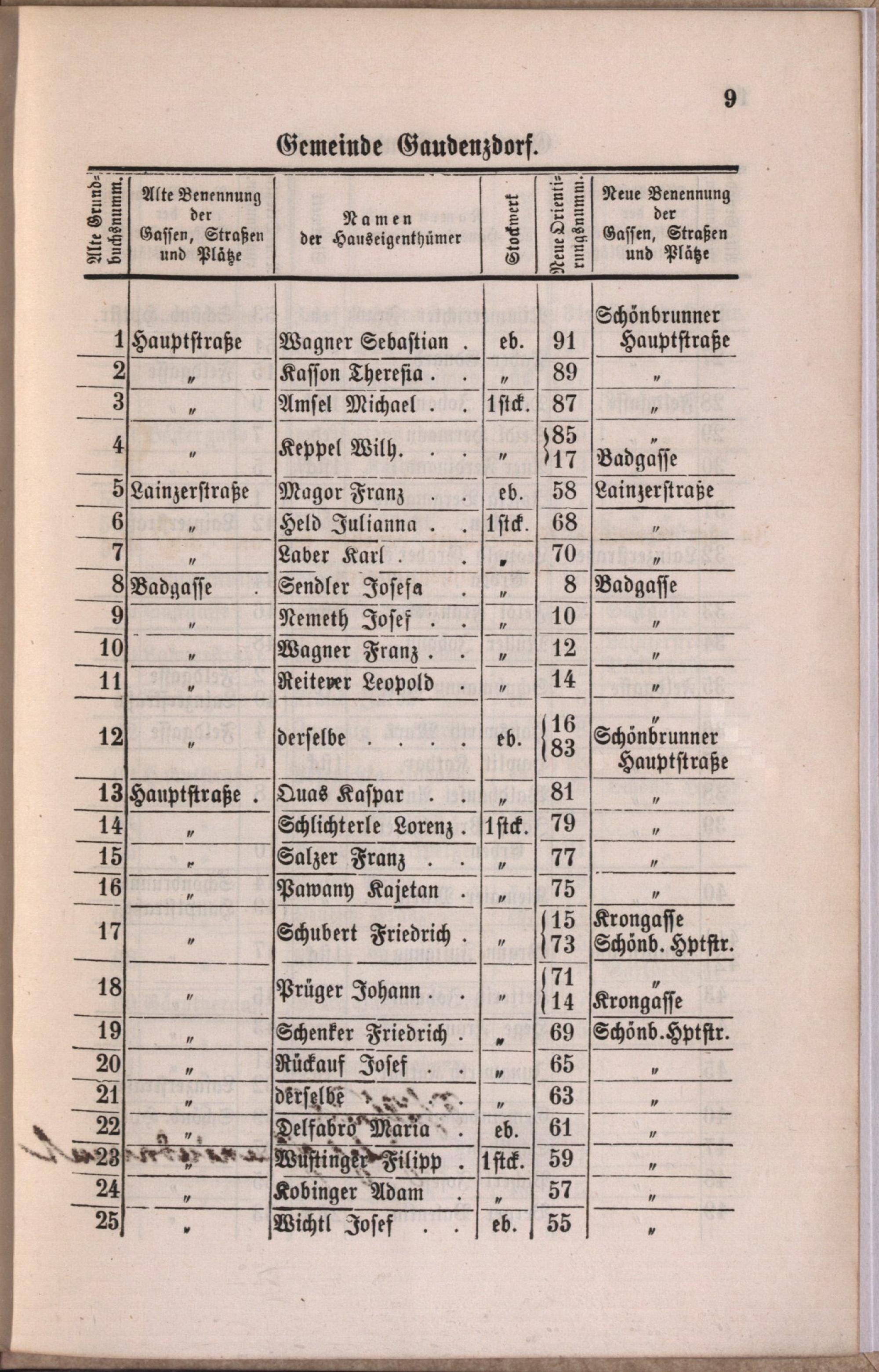 Orientirungs-Schema von Gaudenzdorf mit der neuen gassenweisen Nummerirung und einem Orientirungs-Plane : enthaltend die 301 alten Grundbuchsnummern, die neuen Orientirungsnummern und die neuen Gassenbenennungen