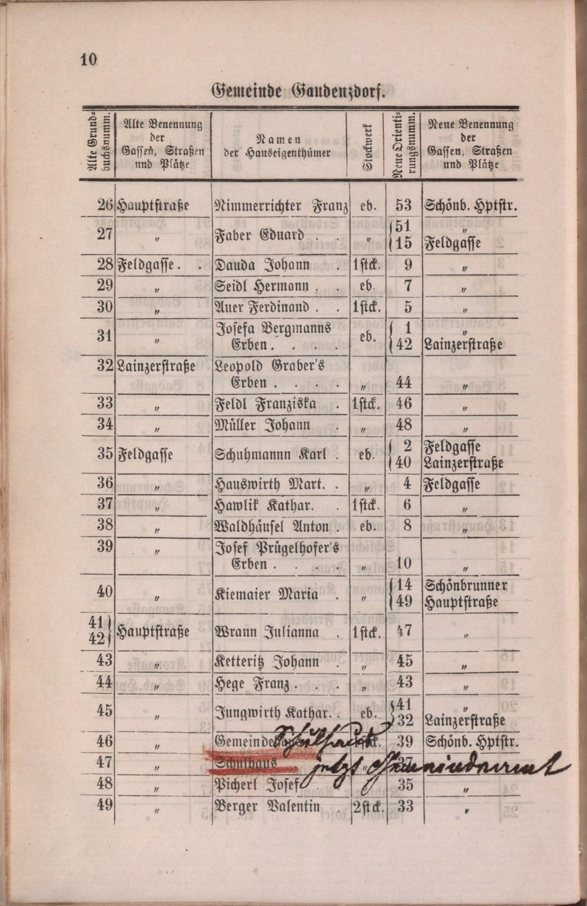 Orientirungs-Schema von Gaudenzdorf mit der neuen gassenweisen Nummerirung und einem Orientirungs-Plane : enthaltend die 301 alten Grundbuchsnummern, die neuen Orientirungsnummern und die neuen Gassenbenennungen