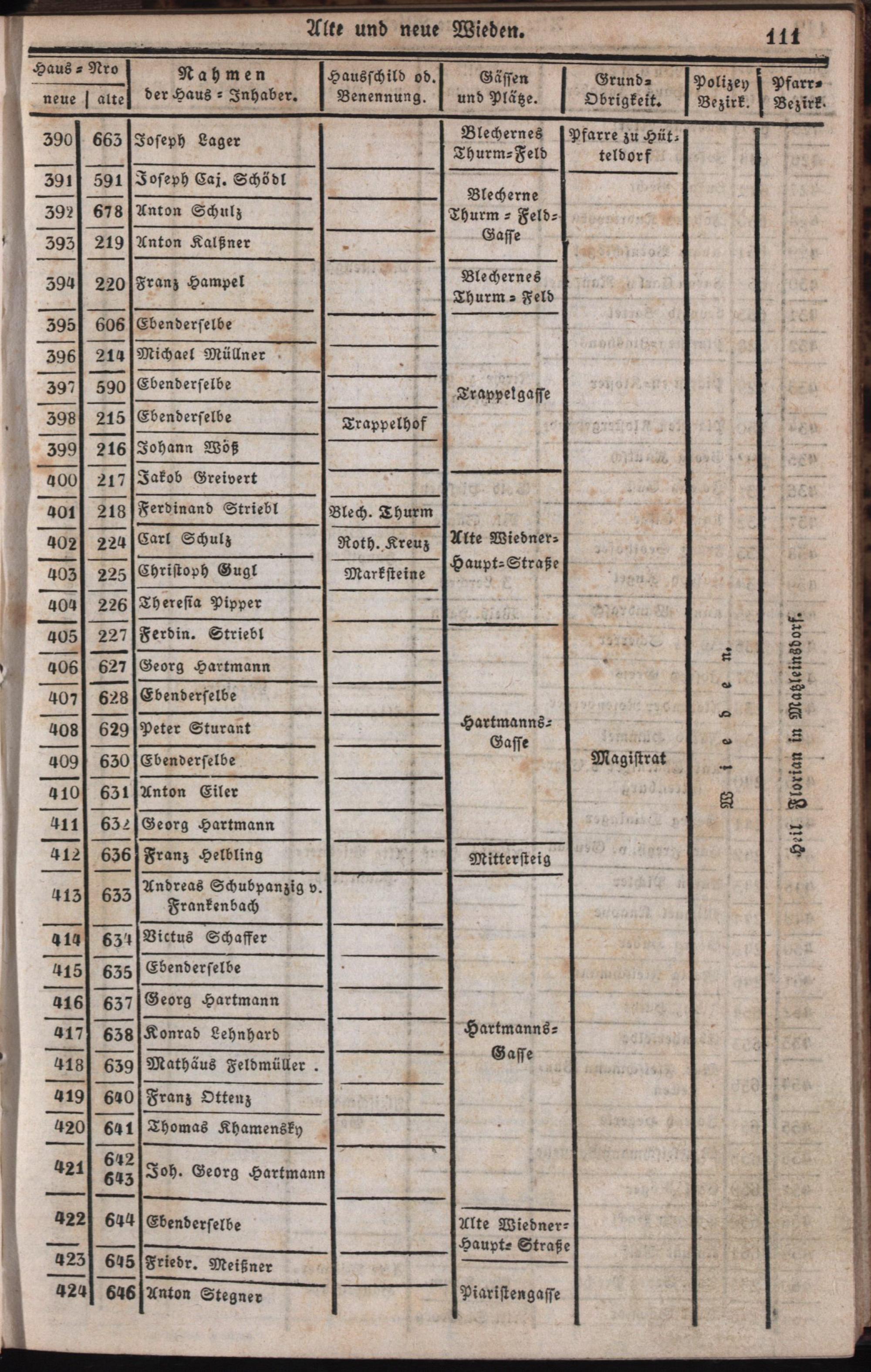 Neuester verbesserter Schema aller in der k.k. Haupt- und Residenzstadt Wien und in ihren Vorstädten befindlichen Häusern : ein nothwendiges Handbuch für Jedermann als richtiger Wegweiser durch die Stadt und sämmtlicher 34 Vorstädte ; mit genauer Angabe sämmtlicher Haus-Nummern, aller dermaligen Haus-Eigenthümer und Haus-Schilder, Straßen, Plätze, Grundobrigkeiten, dann Polizey- und Pfarr-Bezirke