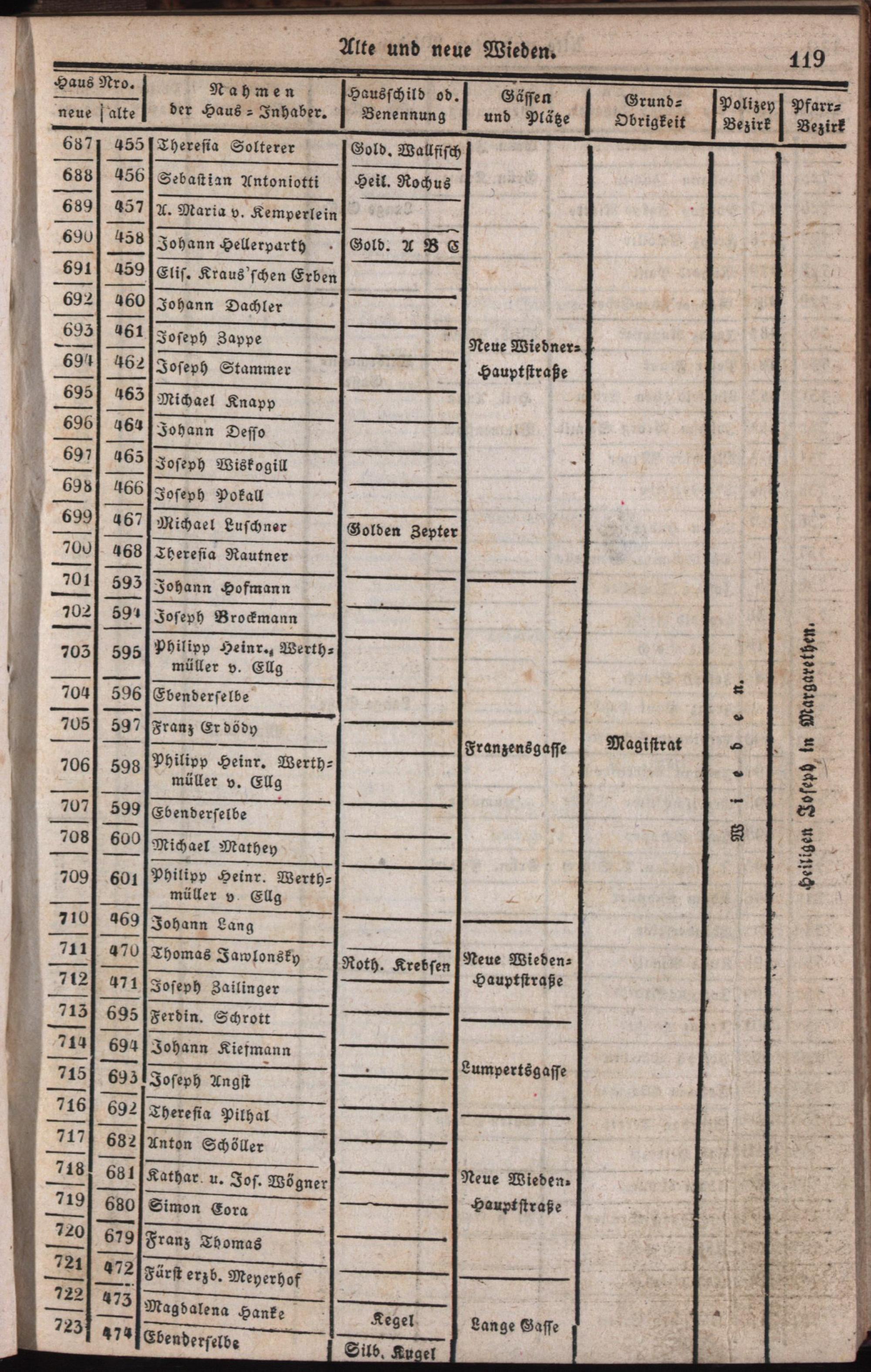 Neuester verbesserter Schema aller in der k.k. Haupt- und Residenzstadt Wien und in ihren Vorstädten befindlichen Häusern : ein nothwendiges Handbuch für Jedermann als richtiger Wegweiser durch die Stadt und sämmtlicher 34 Vorstädte ; mit genauer Angabe sämmtlicher Haus-Nummern, aller dermaligen Haus-Eigenthümer und Haus-Schilder, Straßen, Plätze, Grundobrigkeiten, dann Polizey- und Pfarr-Bezirke