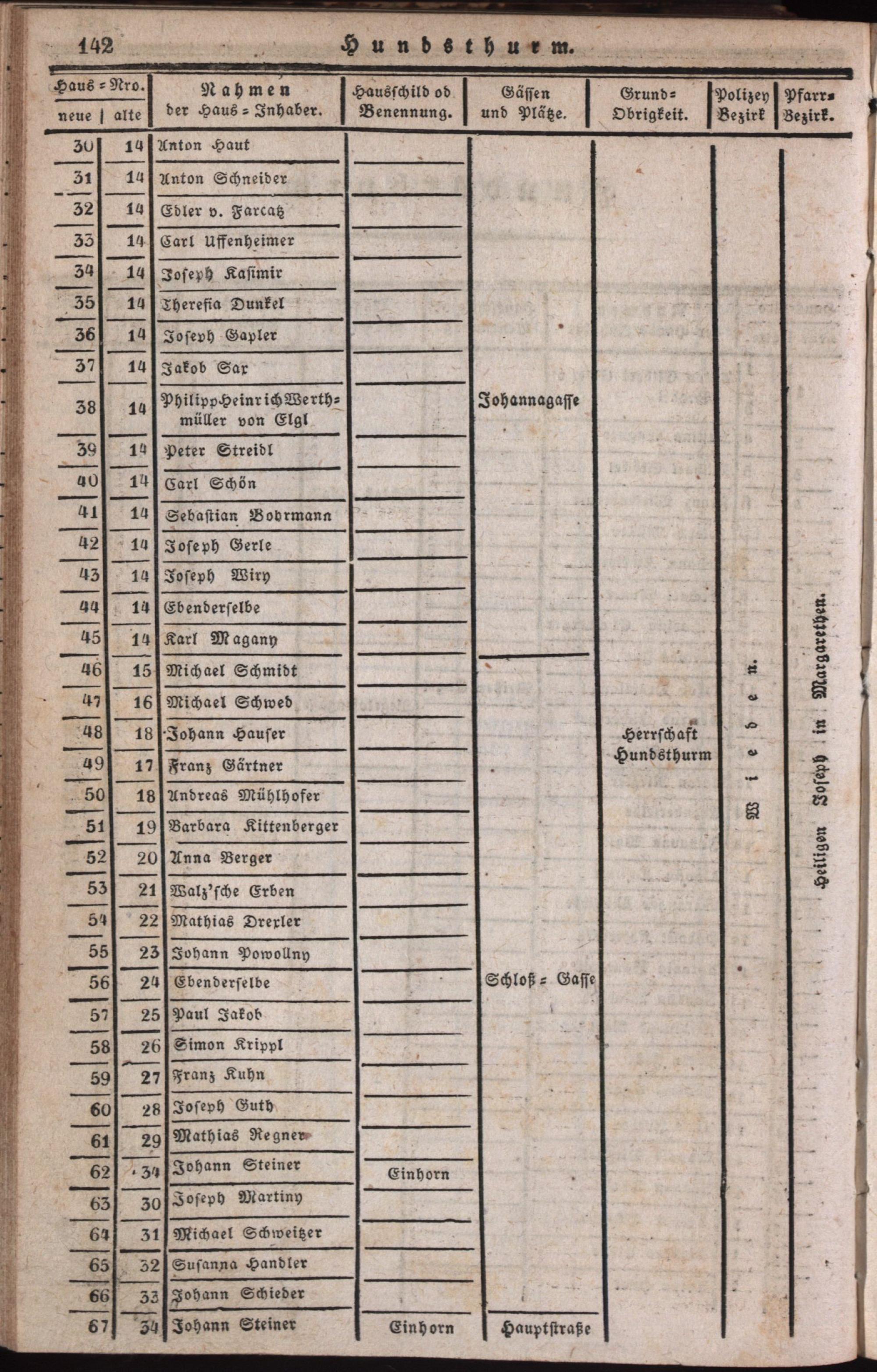 Neuester verbesserter Schema aller in der k.k. Haupt- und Residenzstadt Wien und in ihren Vorstädten befindlichen Häusern : ein nothwendiges Handbuch für Jedermann als richtiger Wegweiser durch die Stadt und sämmtlicher 34 Vorstädte ; mit genauer Angabe sämmtlicher Haus-Nummern, aller dermaligen Haus-Eigenthümer und Haus-Schilder, Straßen, Plätze, Grundobrigkeiten, dann Polizey- und Pfarr-Bezirke