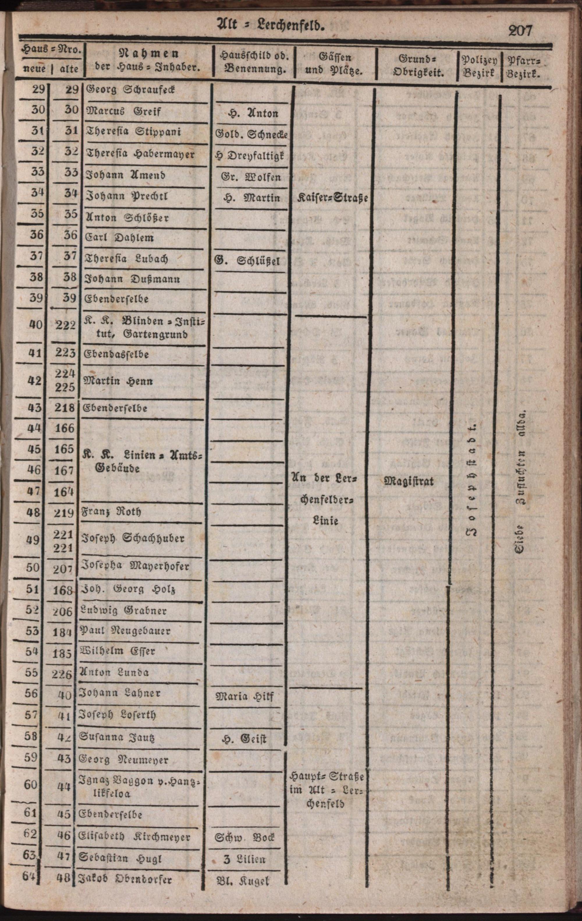 Neuester verbesserter Schema aller in der k.k. Haupt- und Residenzstadt Wien und in ihren Vorstädten befindlichen Häusern : ein nothwendiges Handbuch für Jedermann als richtiger Wegweiser durch die Stadt und sämmtlicher 34 Vorstädte ; mit genauer Angabe sämmtlicher Haus-Nummern, aller dermaligen Haus-Eigenthümer und Haus-Schilder, Straßen, Plätze, Grundobrigkeiten, dann Polizey- und Pfarr-Bezirke