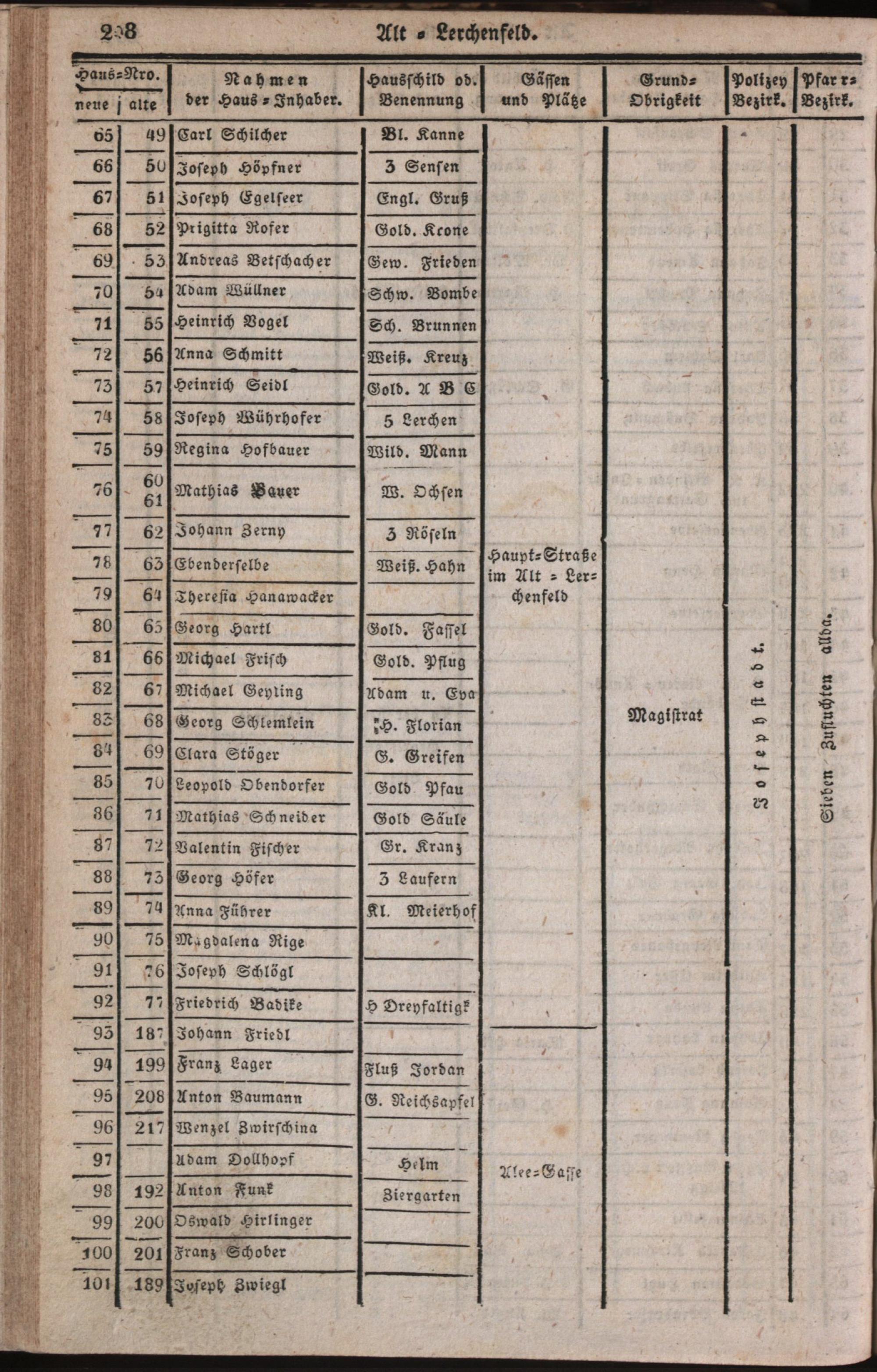 Neuester verbesserter Schema aller in der k.k. Haupt- und Residenzstadt Wien und in ihren Vorstädten befindlichen Häusern : ein nothwendiges Handbuch für Jedermann als richtiger Wegweiser durch die Stadt und sämmtlicher 34 Vorstädte ; mit genauer Angabe sämmtlicher Haus-Nummern, aller dermaligen Haus-Eigenthümer und Haus-Schilder, Straßen, Plätze, Grundobrigkeiten, dann Polizey- und Pfarr-Bezirke