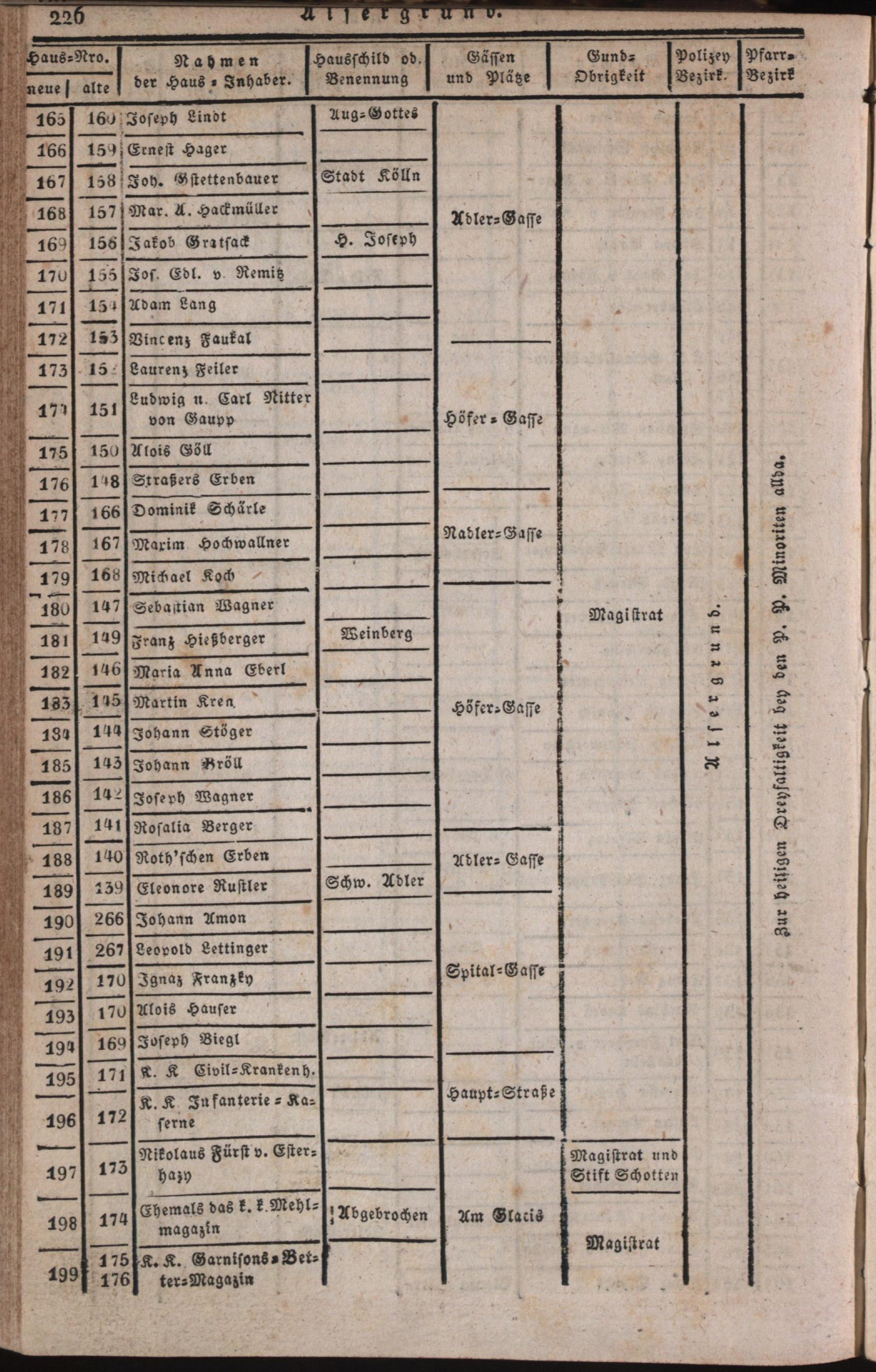 Neuester verbesserter Schema aller in der k.k. Haupt- und Residenzstadt Wien und in ihren Vorstädten befindlichen Häusern : ein nothwendiges Handbuch für Jedermann als richtiger Wegweiser durch die Stadt und sämmtlicher 34 Vorstädte ; mit genauer Angabe sämmtlicher Haus-Nummern, aller dermaligen Haus-Eigenthümer und Haus-Schilder, Straßen, Plätze, Grundobrigkeiten, dann Polizey- und Pfarr-Bezirke