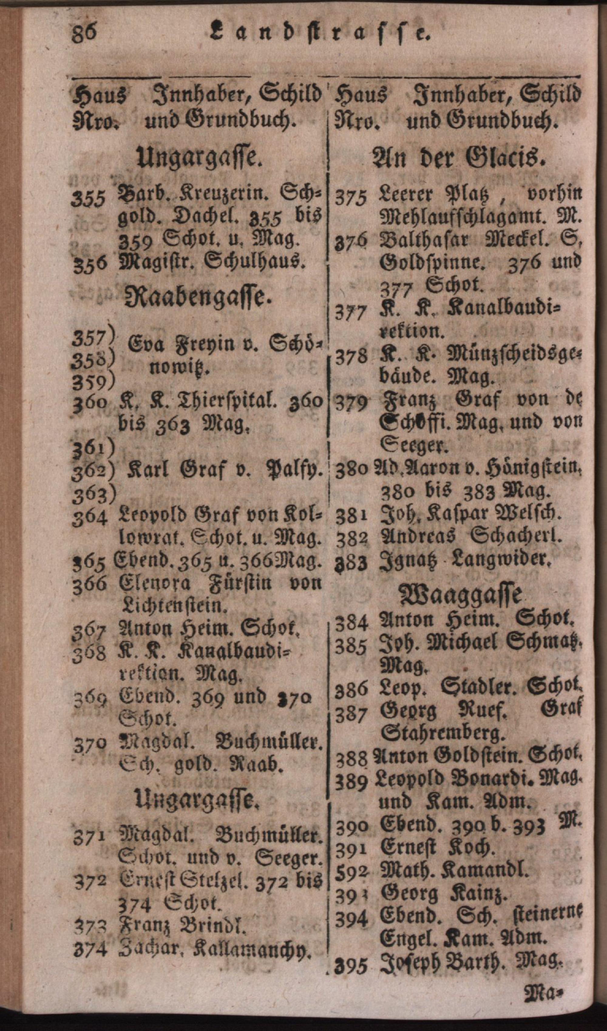 Vollständiges Verzeichniß aller in der kaiserlichen auch k. k. Haupt- und Residenz-Stadt Wien inner denen Linien befindlichen numerirten Häuser deren Eigenthümer, Strassen, Gässen, Plätze und Schilder : nebst genauer Anzeige der Grundbücher und Pfarren zu denen jedes Haus gehört, und einem sehr wichtigen Anhange / verf. von Joseph Johann Grosbauer