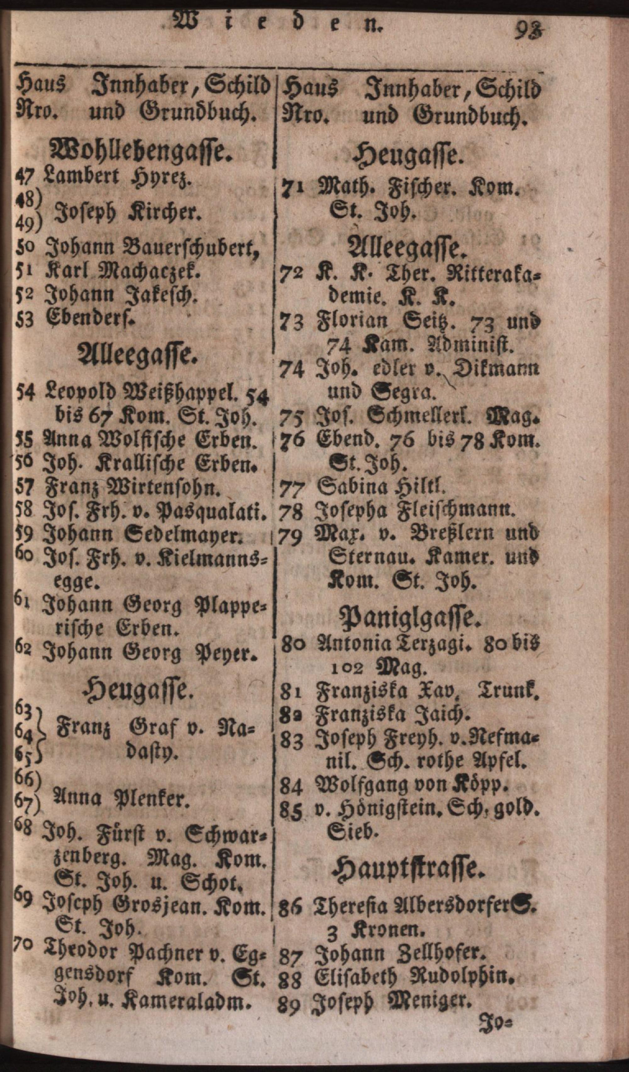 Vollständiges Verzeichniß aller in der kaiserlichen auch k. k. Haupt- und Residenz-Stadt Wien inner denen Linien befindlichen numerirten Häuser deren Eigenthümer, Strassen, Gässen, Plätze und Schilder : nebst genauer Anzeige der Grundbücher und Pfarren zu denen jedes Haus gehört, und einem sehr wichtigen Anhange / verf. von Joseph Johann Grosbauer