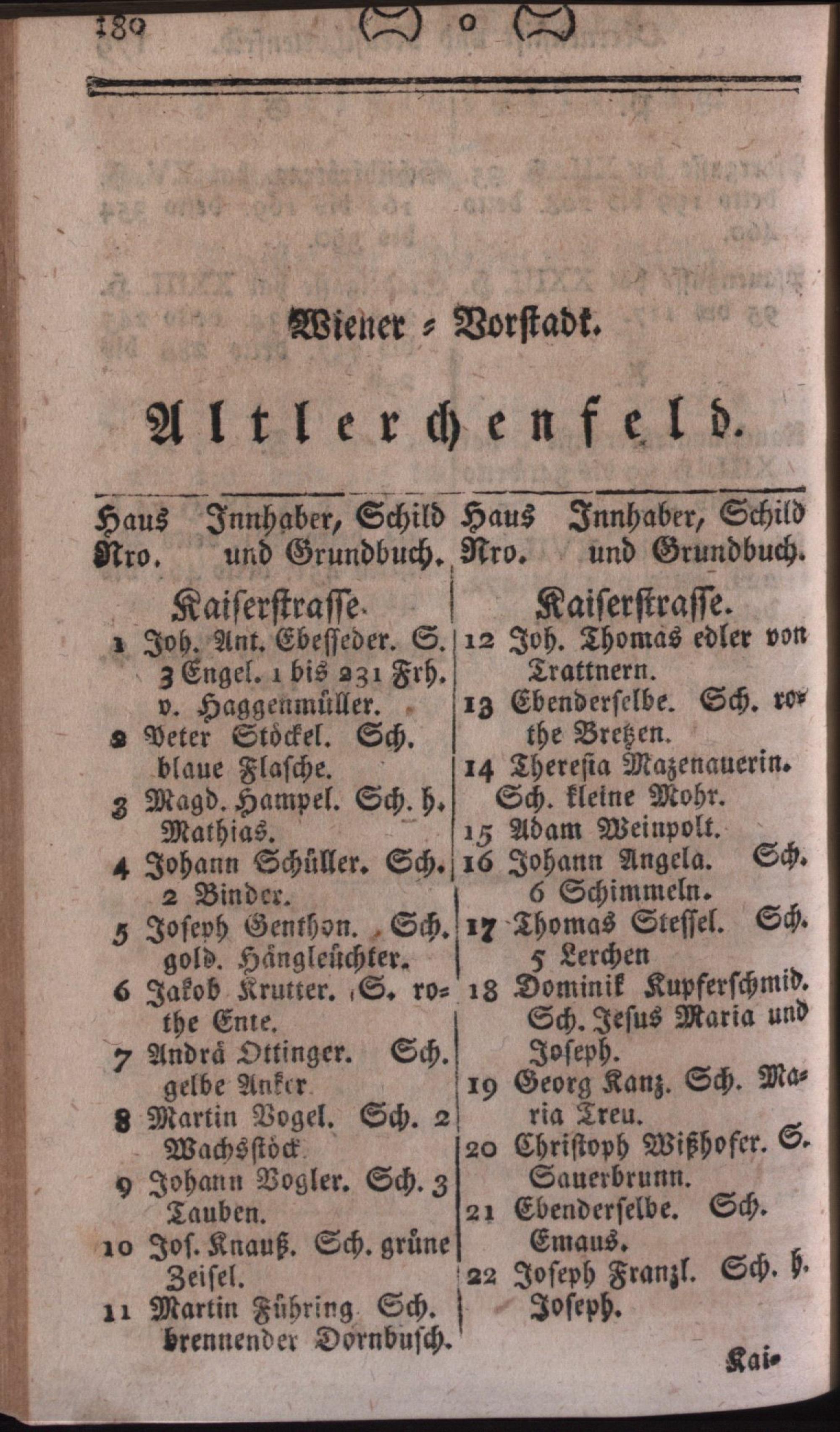 Vollständiges Verzeichniß aller in der kaiserlichen auch k. k. Haupt- und Residenz-Stadt Wien inner denen Linien befindlichen numerirten Häuser deren Eigenthümer, Strassen, Gässen, Plätze und Schilder : nebst genauer Anzeige der Grundbücher und Pfarren zu denen jedes Haus gehört, und einem sehr wichtigen Anhange / verf. von Joseph Johann Grosbauer