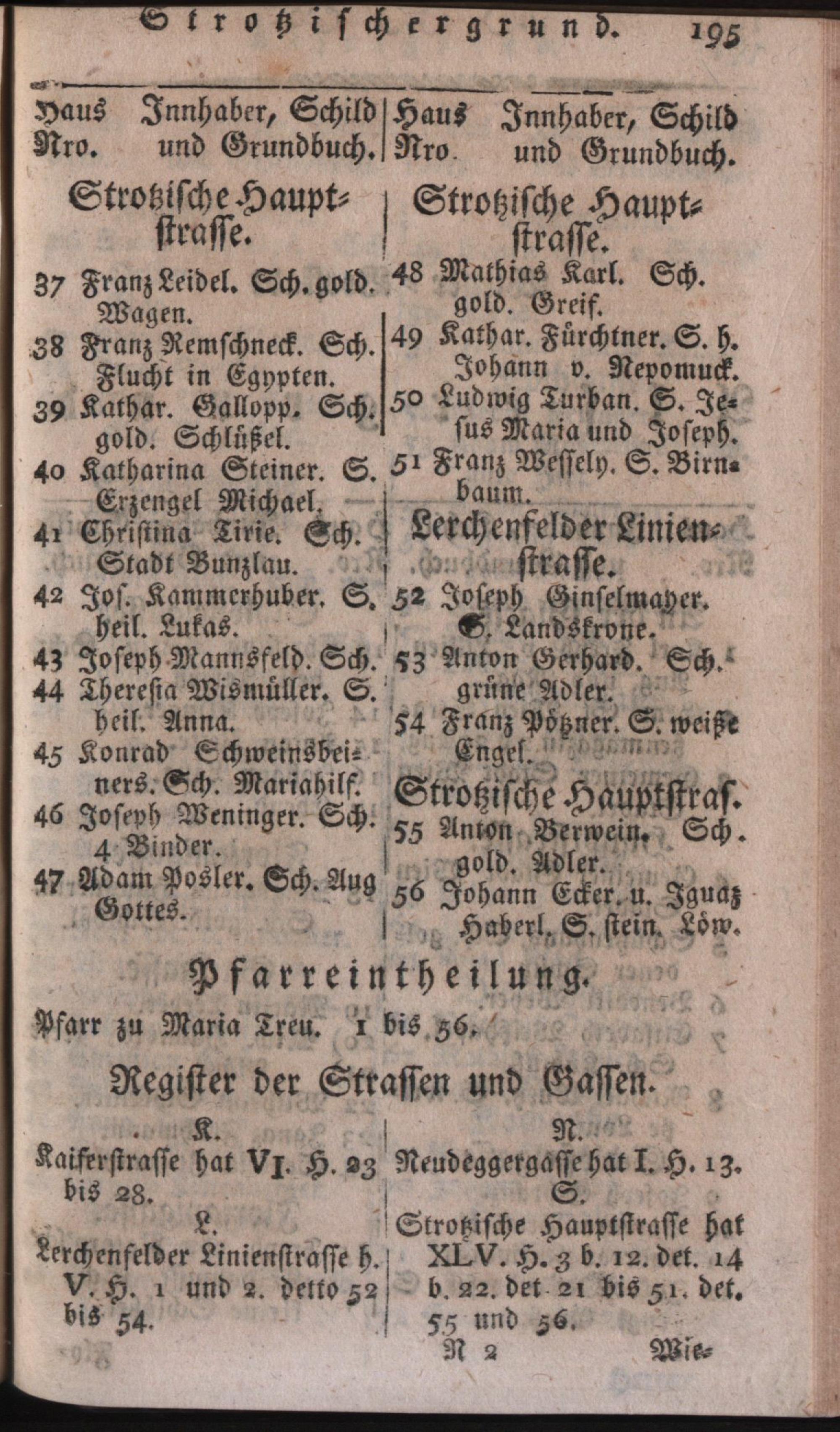 Vollständiges Verzeichniß aller in der kaiserlichen auch k. k. Haupt- und Residenz-Stadt Wien inner denen Linien befindlichen numerirten Häuser deren Eigenthümer, Strassen, Gässen, Plätze und Schilder : nebst genauer Anzeige der Grundbücher und Pfarren zu denen jedes Haus gehört, und einem sehr wichtigen Anhange / verf. von Joseph Johann Grosbauer