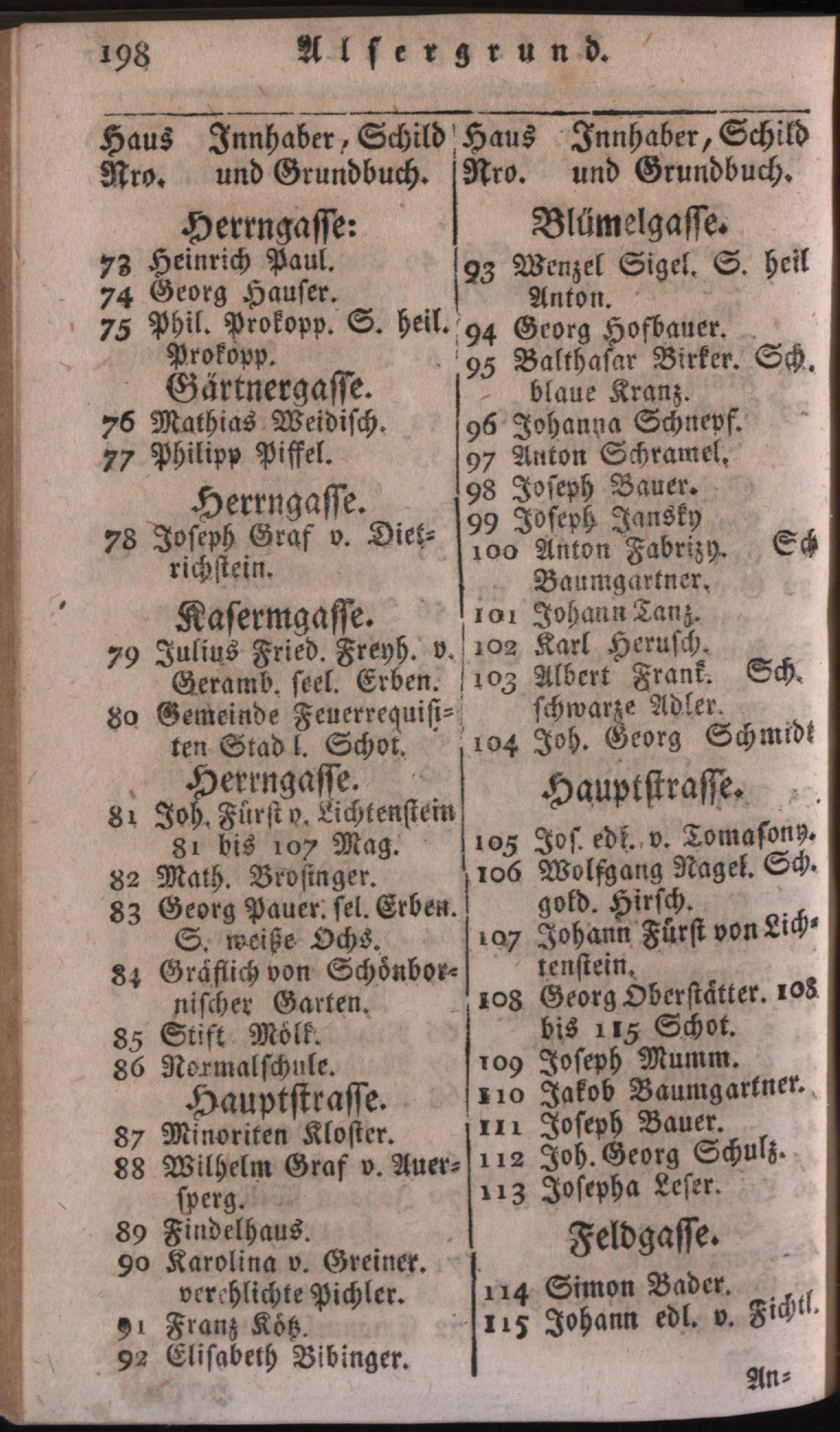 Vollständiges Verzeichniß aller in der kaiserlichen auch k. k. Haupt- und Residenz-Stadt Wien inner denen Linien befindlichen numerirten Häuser deren Eigenthümer, Strassen, Gässen, Plätze und Schilder : nebst genauer Anzeige der Grundbücher und Pfarren zu denen jedes Haus gehört, und einem sehr wichtigen Anhange / verf. von Joseph Johann Grosbauer