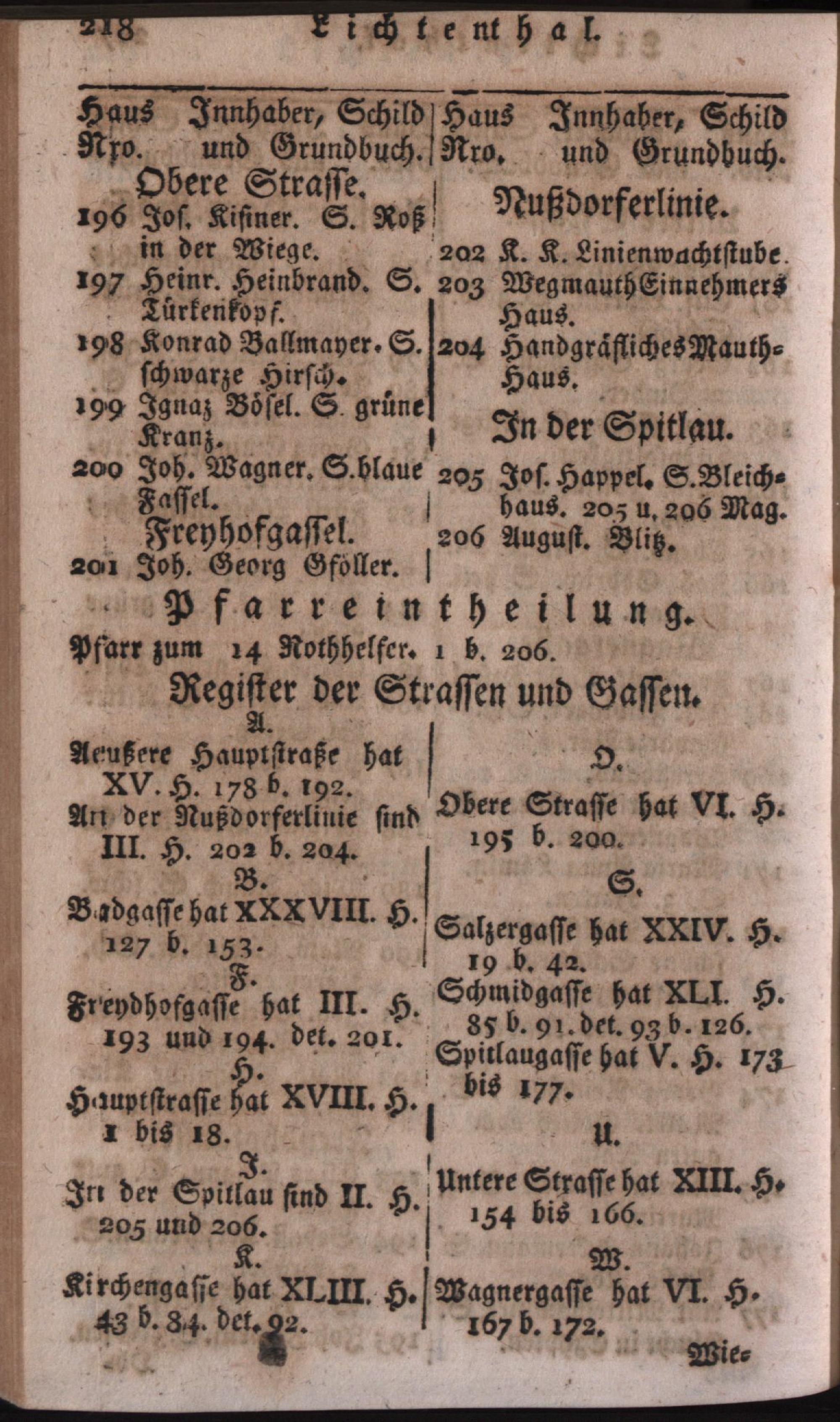 Vollständiges Verzeichniß aller in der kaiserlichen auch k. k. Haupt- und Residenz-Stadt Wien inner denen Linien befindlichen numerirten Häuser deren Eigenthümer, Strassen, Gässen, Plätze und Schilder : nebst genauer Anzeige der Grundbücher und Pfarren zu denen jedes Haus gehört, und einem sehr wichtigen Anhange / verf. von Joseph Johann Grosbauer