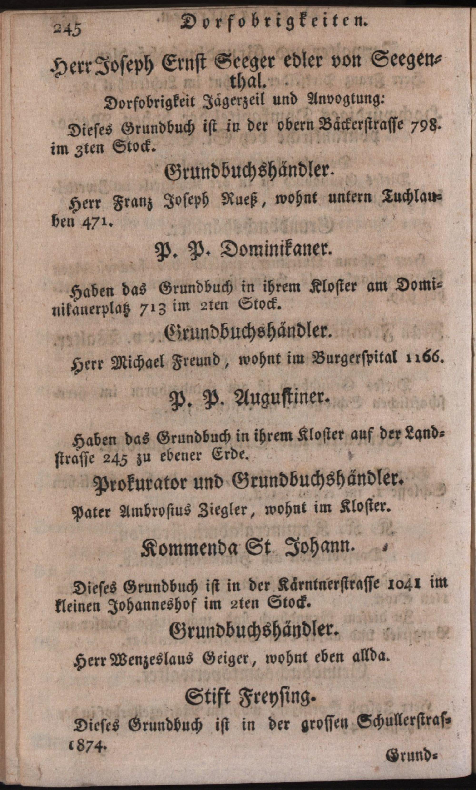 Vollständiges Verzeichniß aller in der kaiserlichen auch k. k. Haupt- und Residenz-Stadt Wien inner denen Linien befindlichen numerirten Häuser deren Eigenthümer, Strassen, Gässen, Plätze und Schilder : nebst genauer Anzeige der Grundbücher und Pfarren zu denen jedes Haus gehört, und einem sehr wichtigen Anhange / verf. von Joseph Johann Grosbauer